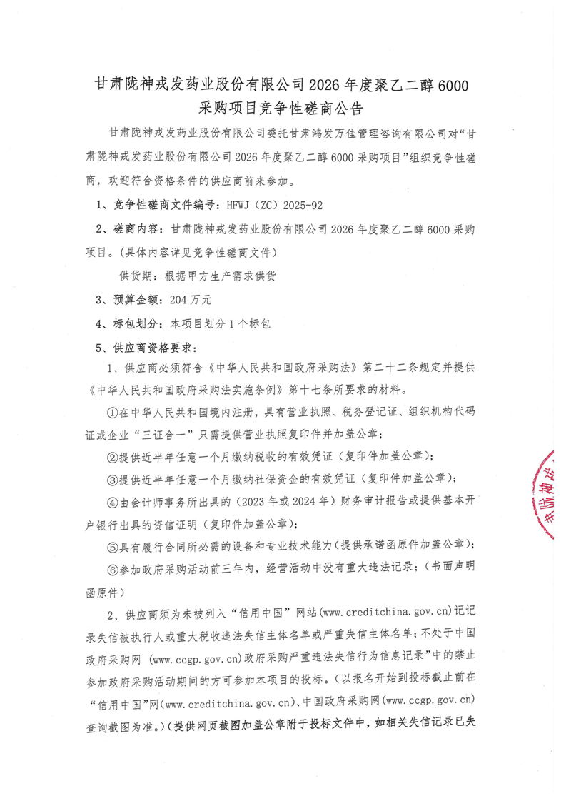 甘肅隴神戎發(fā)藥業(yè)股份有限公司2026年度聚乙二醇6000采購項(xiàng)目競(jìng)爭(zhēng)性磋商公告