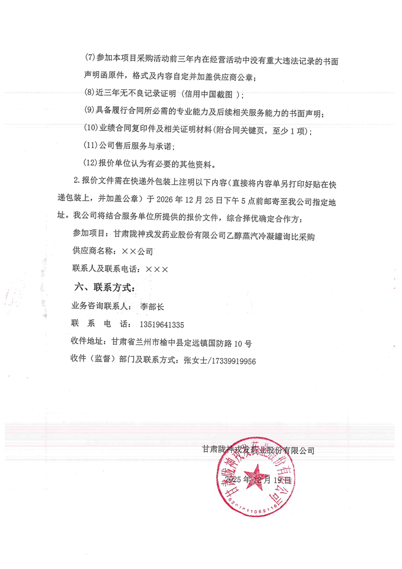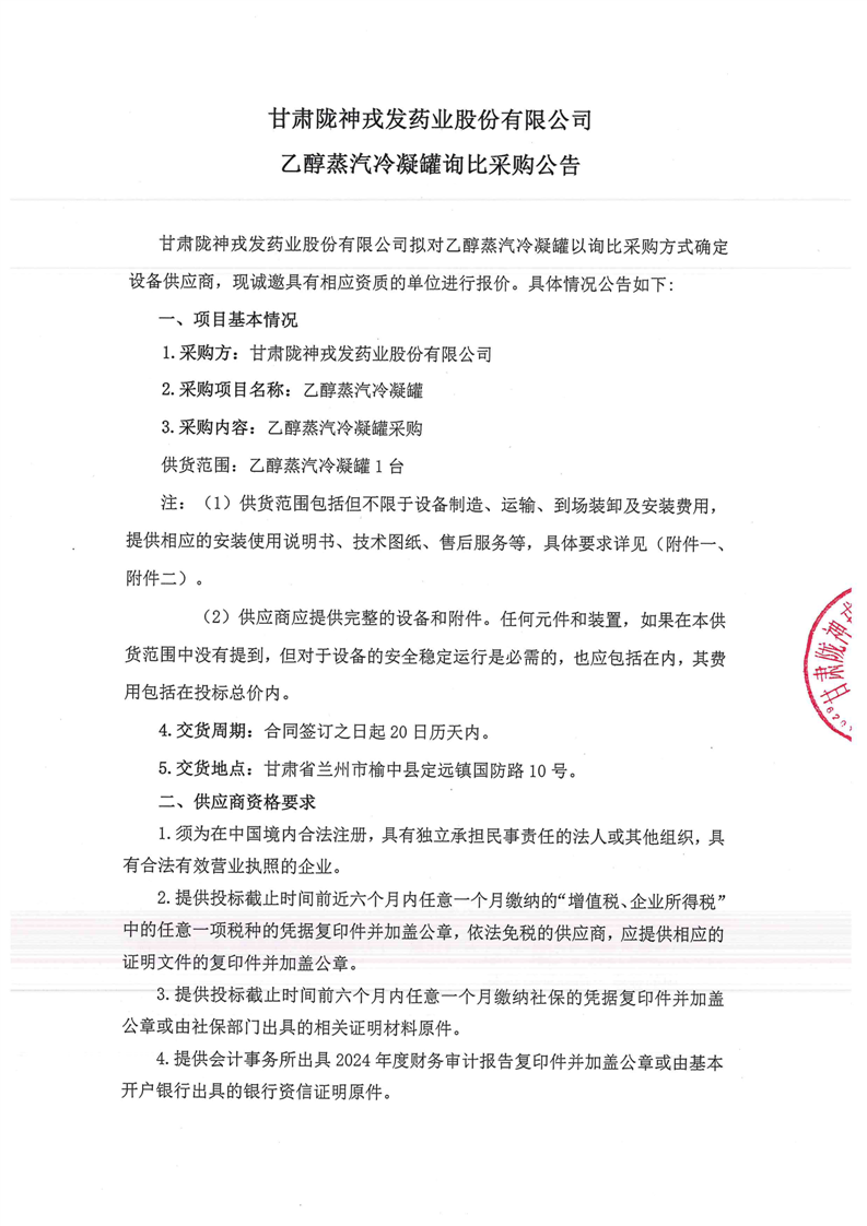 甘肅隴神戎發(fā)藥業(yè)股份有限公司乙醇蒸汽冷凝罐詢比采購公告