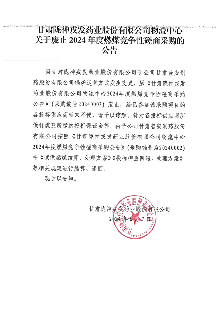 甘肅隴神戎發(fā)藥業(yè)股份有限公司物流中心關于廢止2024年度燃煤競爭性磋商采購的公告