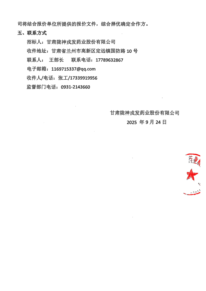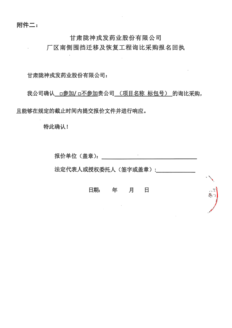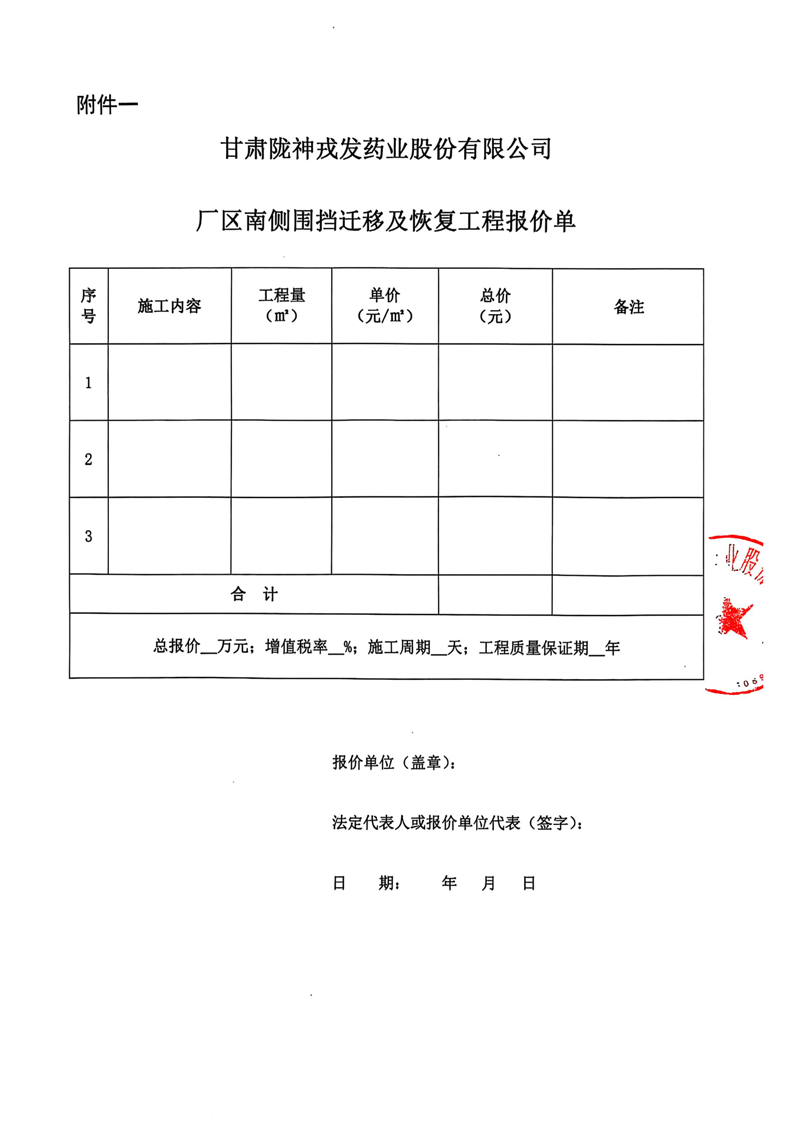 甘肅隴神戎發(fā)藥業(yè)股份有限公司廠區(qū)南側(cè)圍擋遷移及恢復(fù)工程詢比采購公告