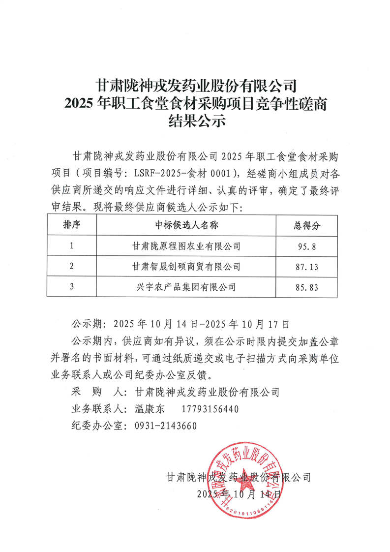 甘肅隴神戎發(fā)藥業(yè)股份有限公司2025年職工食堂食材采購(gòu)項(xiàng)目競(jìng)爭(zhēng)性磋商結(jié)果公示