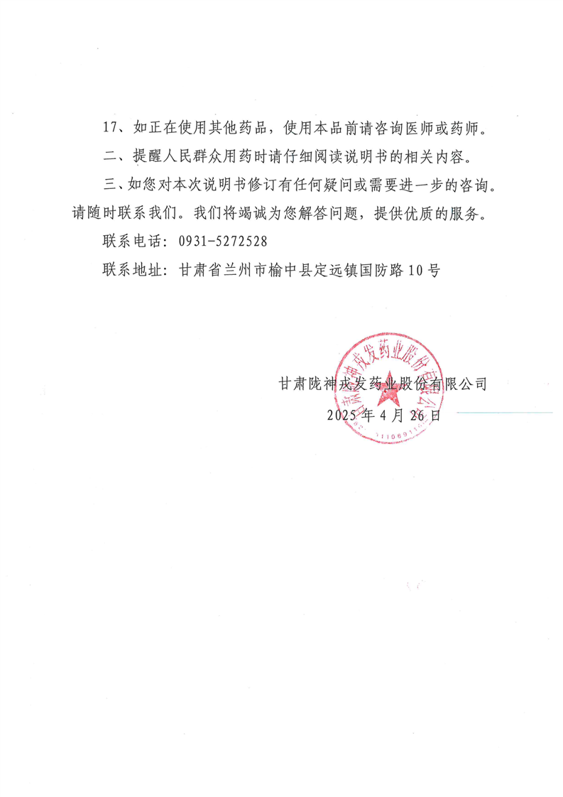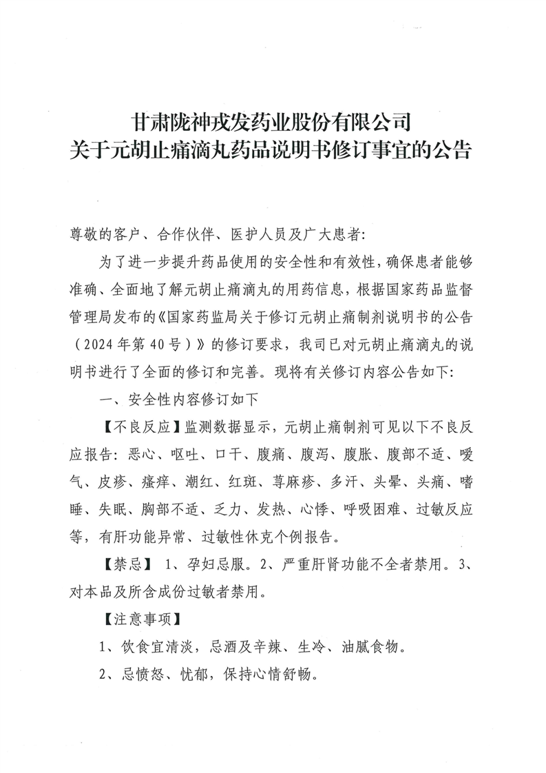 甘肅隴神戎發(fā)藥業(yè)股份有限公司關(guān)于元胡止痛滴丸藥品說明書修訂事宜的公告