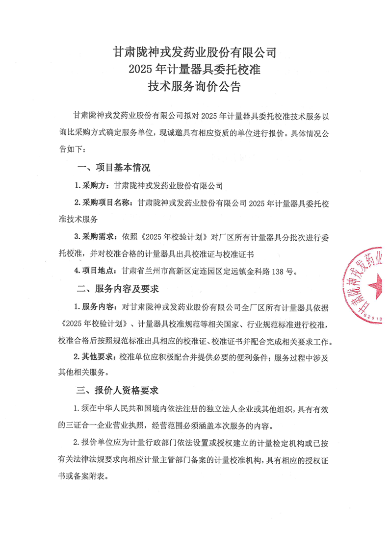 甘肅隴神戎發(fā)藥業(yè)股份有限公司2025年計(jì)量器具委托校準(zhǔn)技術(shù)服務(wù)詢價(jià)公告