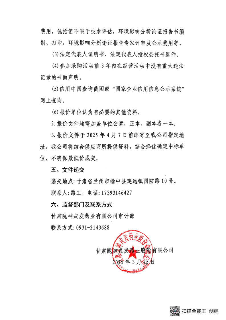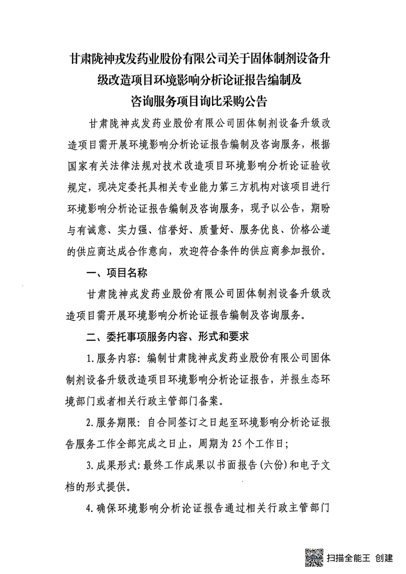 甘肅隴神戎發(fā)藥業(yè)股份有限公司關(guān)于固體制劑設(shè)備升級改造項(xiàng)目環(huán)境影響分析論證報(bào)告編制及咨詢服務(wù)項(xiàng)目詢比采購公告