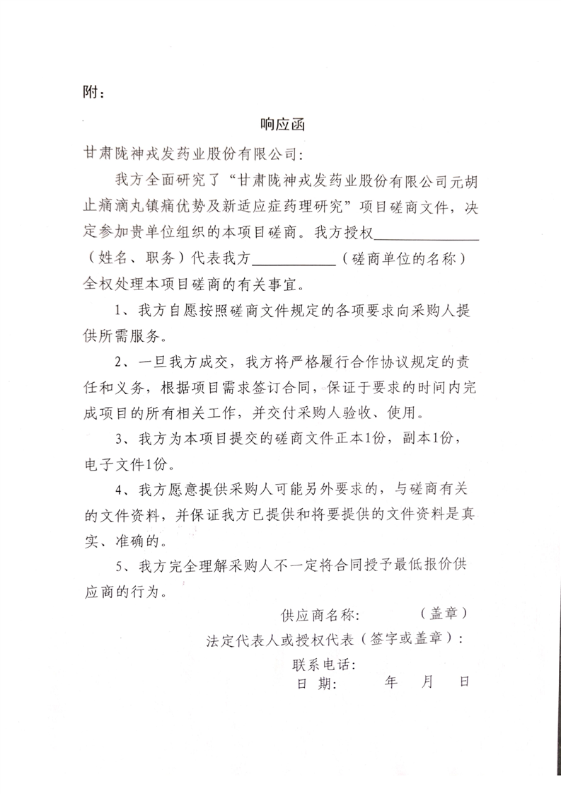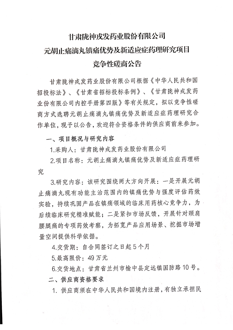 甘肅隴神戎發(fā)藥業(yè)股份有限公司元胡止痛滴丸鎮(zhèn)痛優(yōu)勢及新適應(yīng)癥藥理研究項目競爭性磋商公告