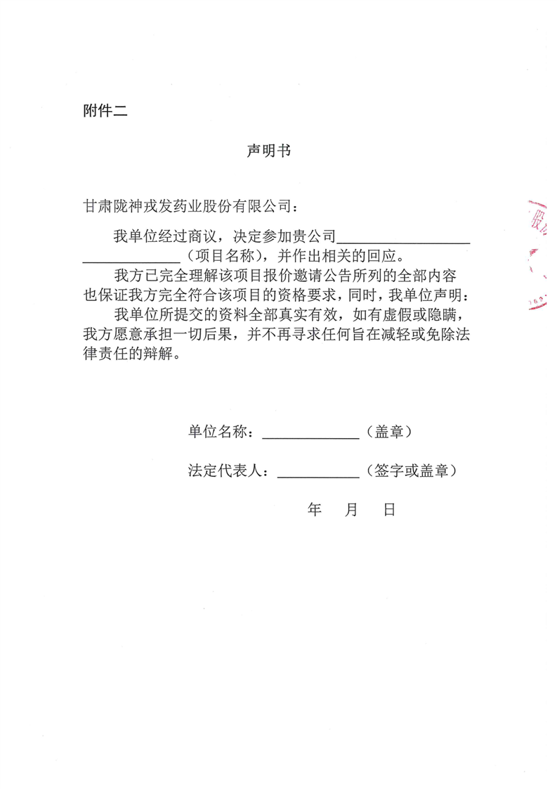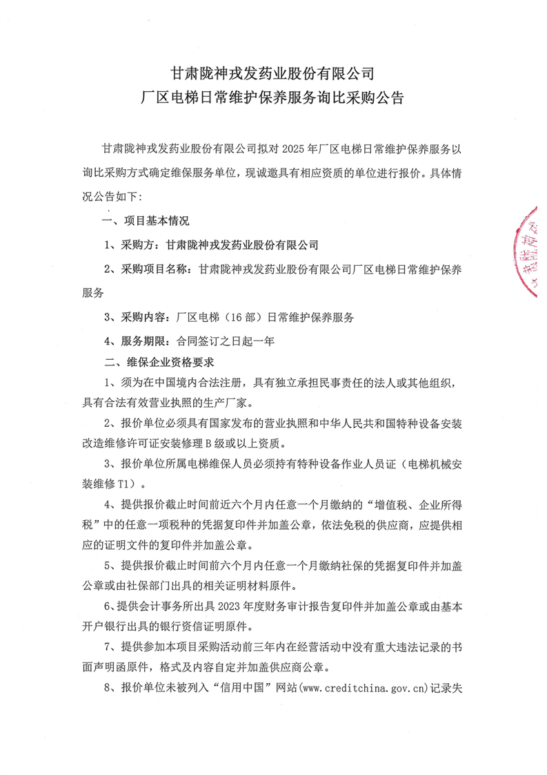 甘肅隴神戎發(fā)藥業(yè)股份有限公司廠區(qū)電梯日常維護保養(yǎng)服務詢比采購公告