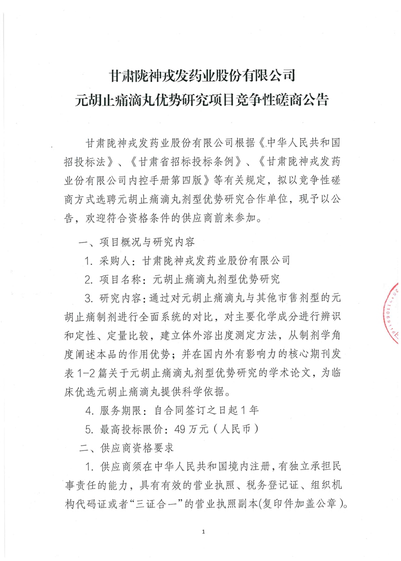 甘肅隴神戎發(fā)藥業(yè)股份有限公司元胡止痛滴丸優(yōu)勢研究項目競爭性磋商公告