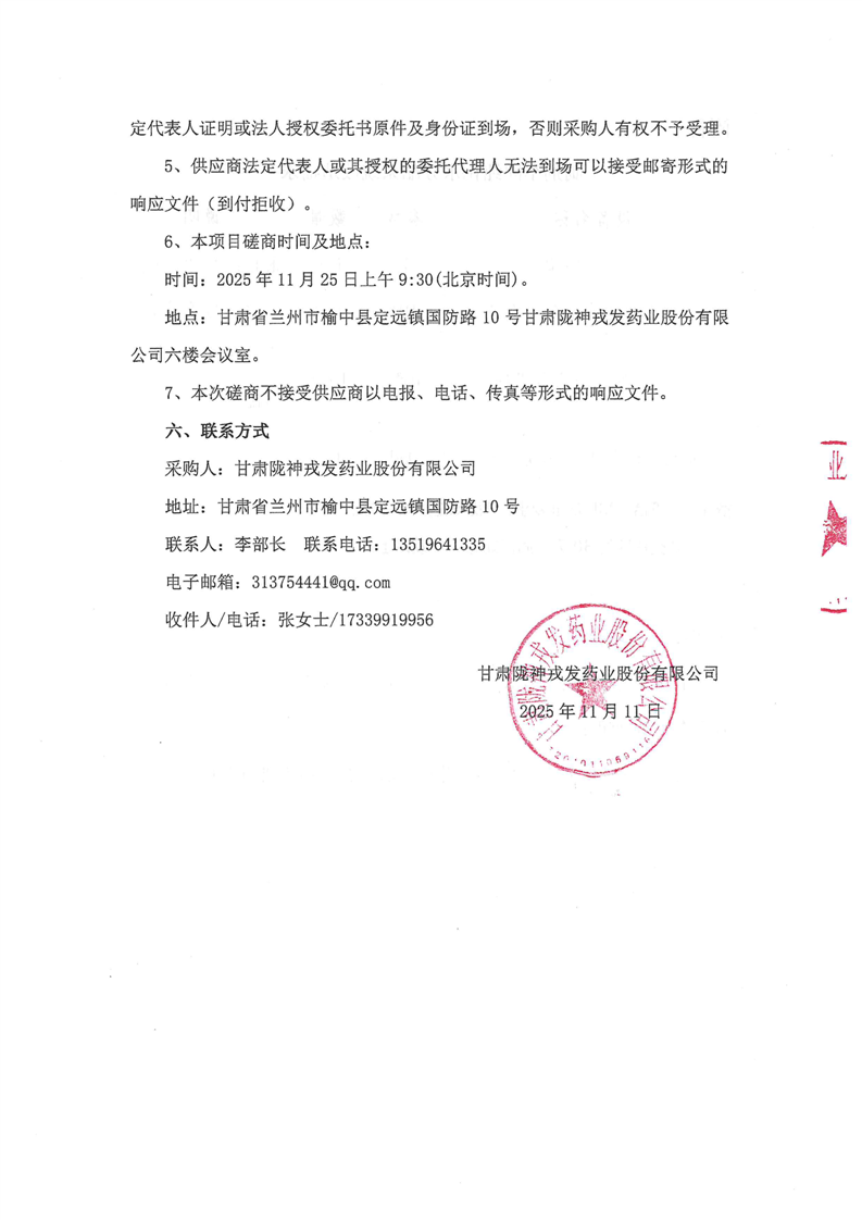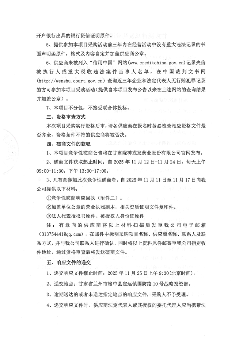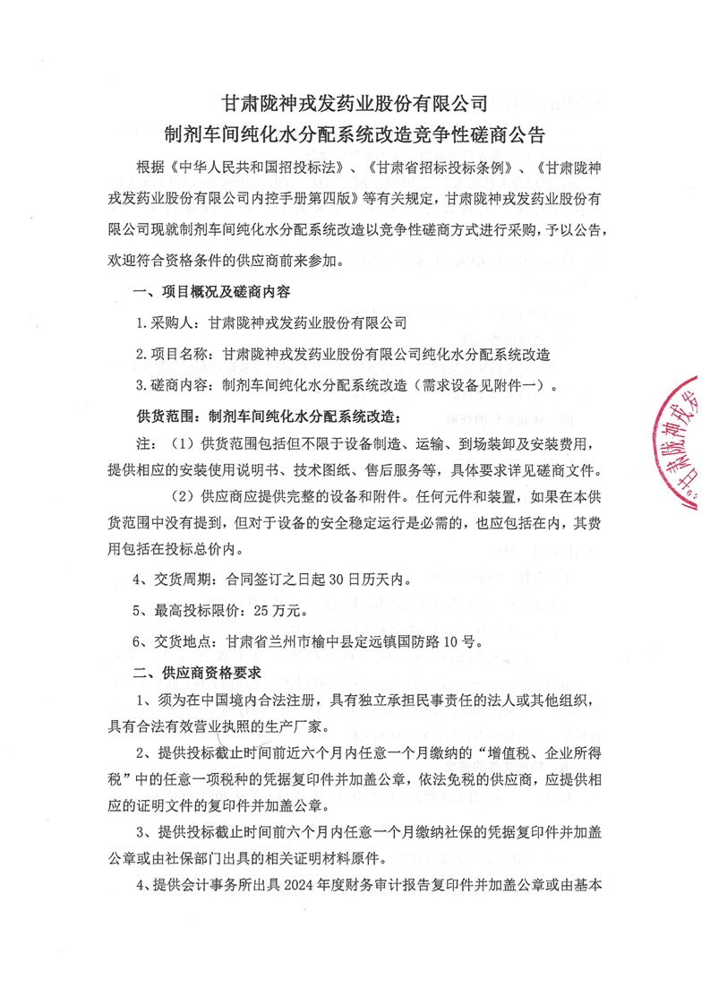甘肅隴神戎發(fā)藥業(yè)股份有限公司制劑車間純化水分配系統(tǒng)改造競(jìng)爭(zhēng)性磋商公告