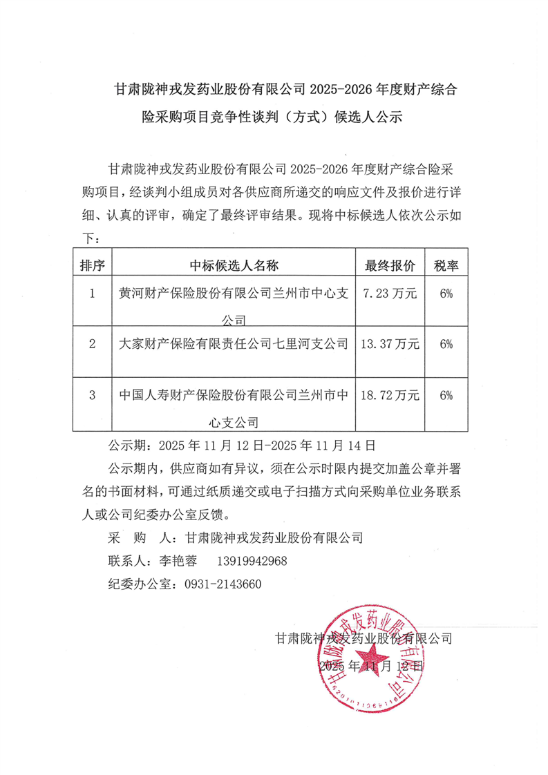甘肅隴神戎發(fā)藥業(yè)股份有限公司2025-2026年度財產(chǎn)綜合險采購項目競爭性談判(方式)候選人公示