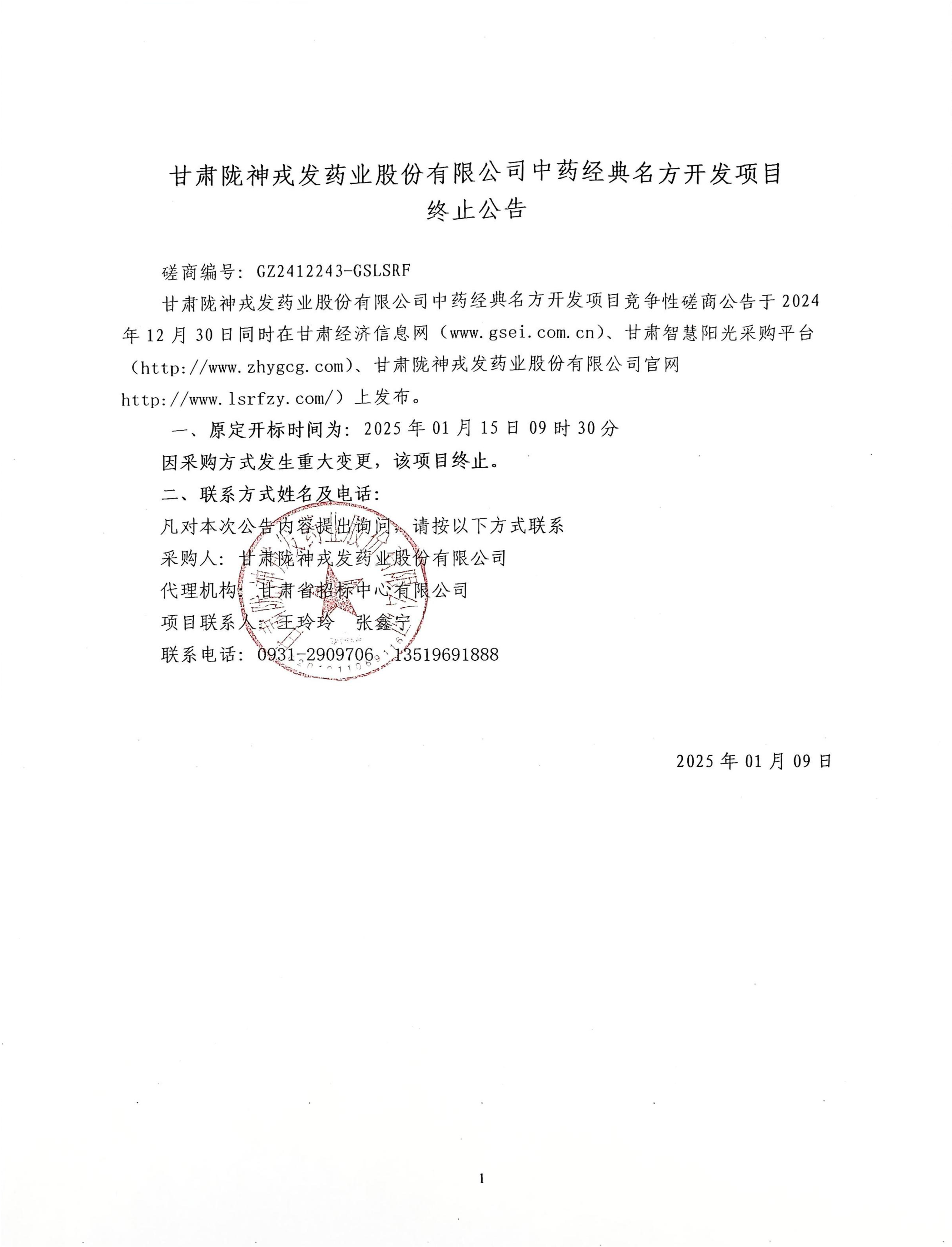 甘肅隴神戎發(fā)藥業(yè)股份有限公司中藥經(jīng)典名方開發(fā)項目終止公告