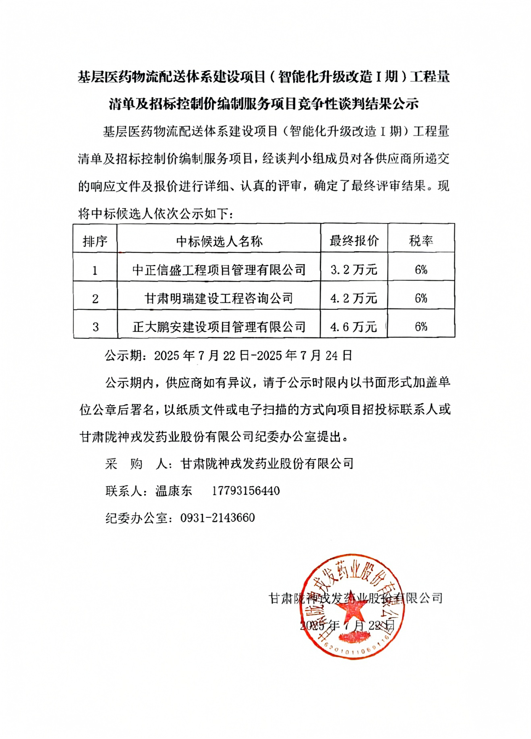 基層醫(yī)藥物流配送體系建設(shè)項(xiàng)目(智能化升級(jí)改造I期)工程量清單及招標(biāo)控制價(jià)編制服務(wù)項(xiàng)目競(jìng)爭(zhēng)性談判結(jié)果公示