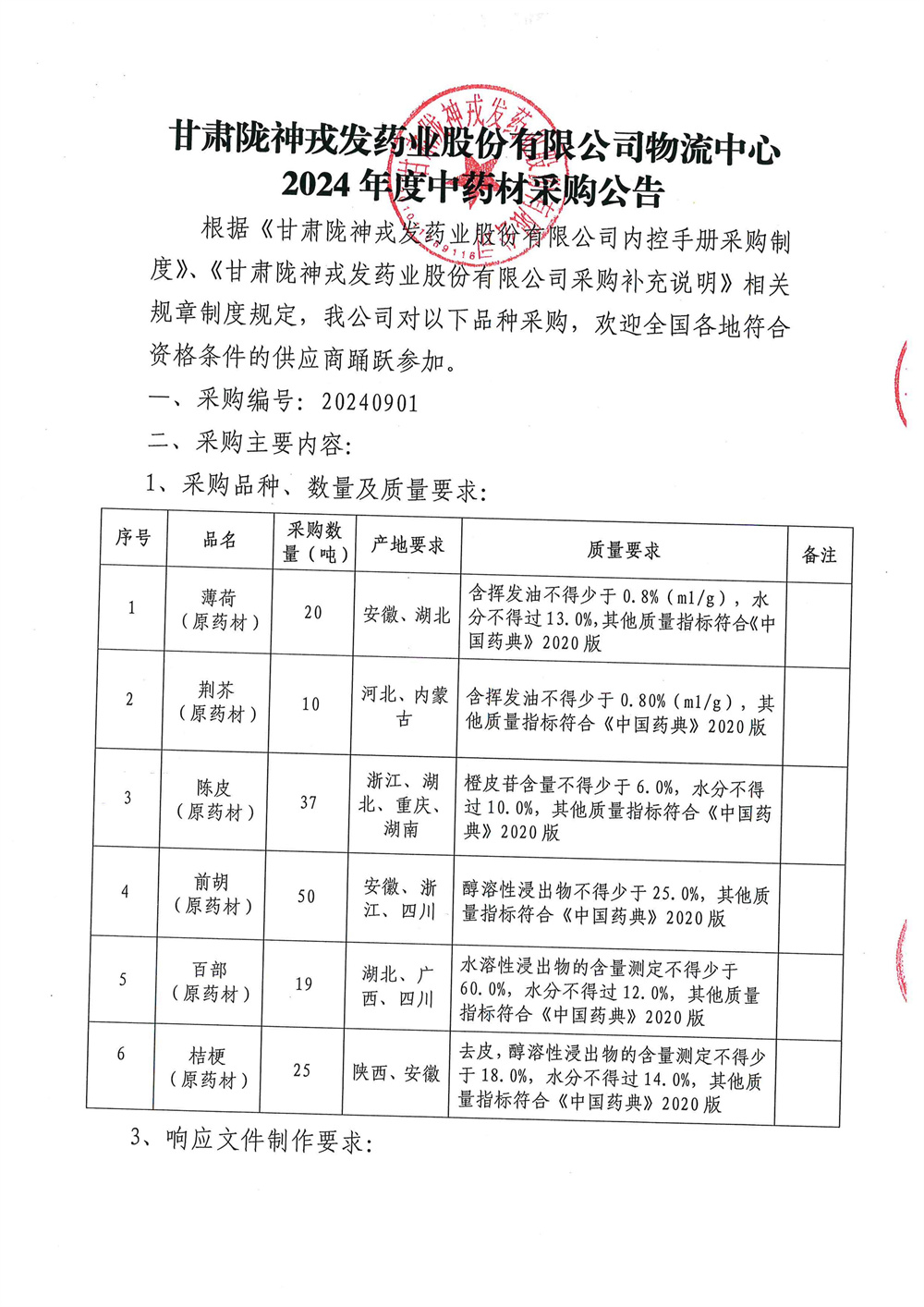 甘肅隴神戎發(fā)藥業(yè)股份有限公司物流中心2024年度中藥材招標采購公告