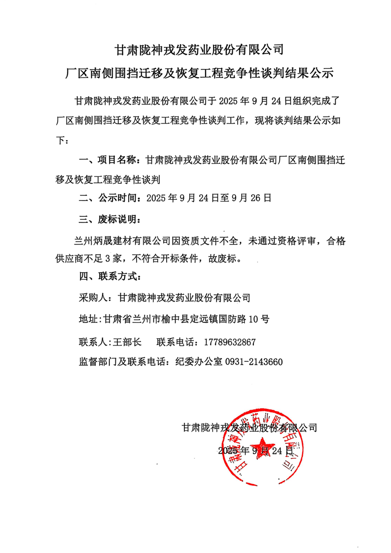 甘肅隴神戎發(fā)藥業(yè)股份有限公司廠區(qū)南側(cè)圍擋遷移及恢復(fù)工程競爭性談判結(jié)果公示