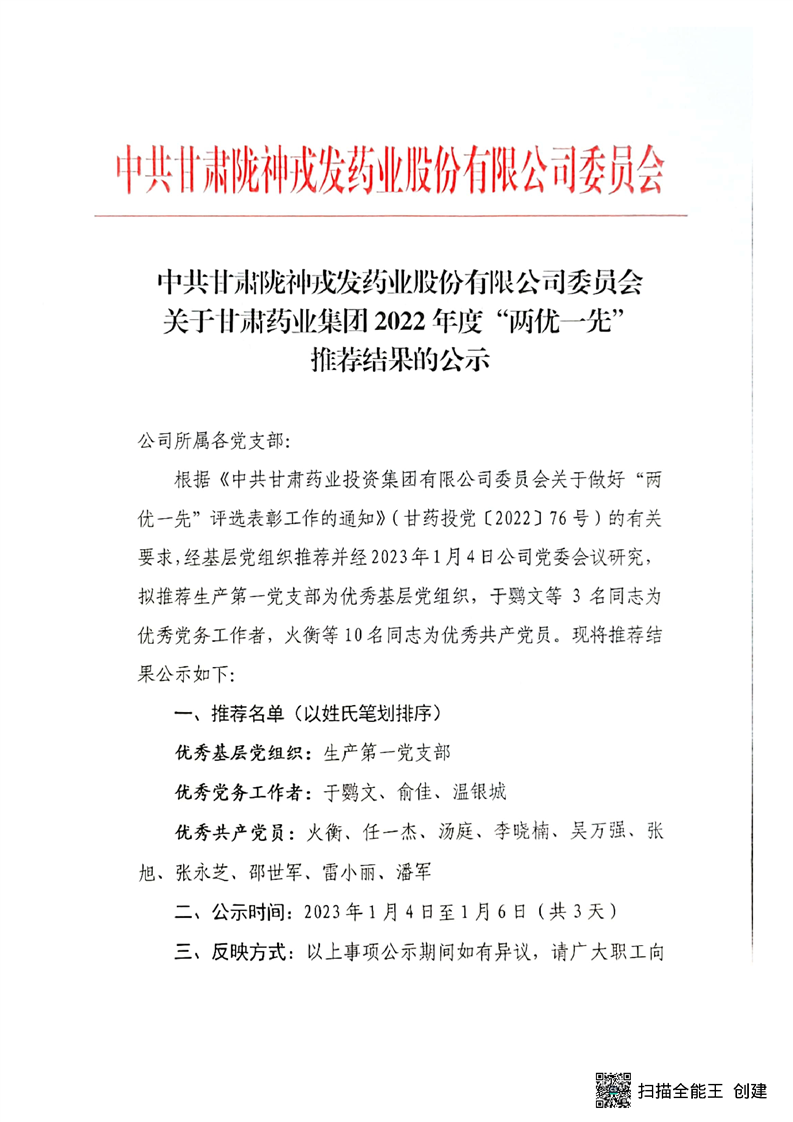 關(guān)于甘肅藥業(yè)集團(tuán)2022年度“兩優(yōu)一先”推薦結(jié)果的公示