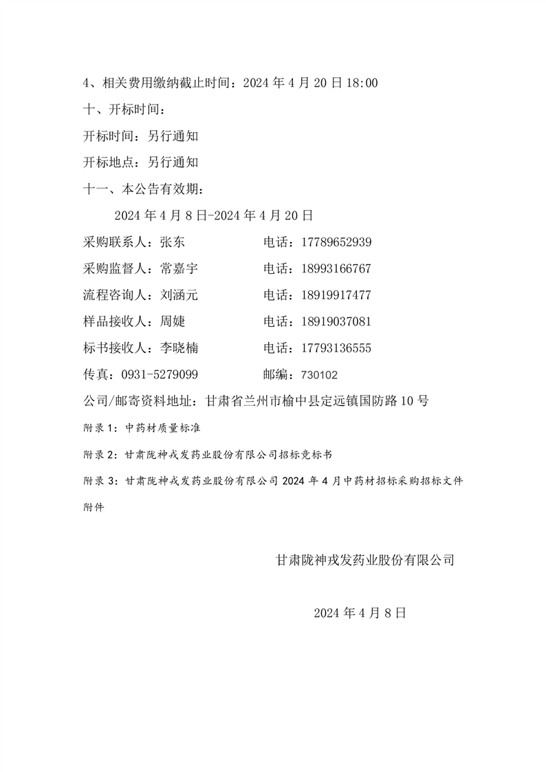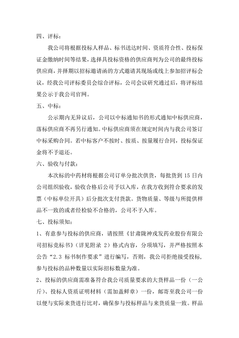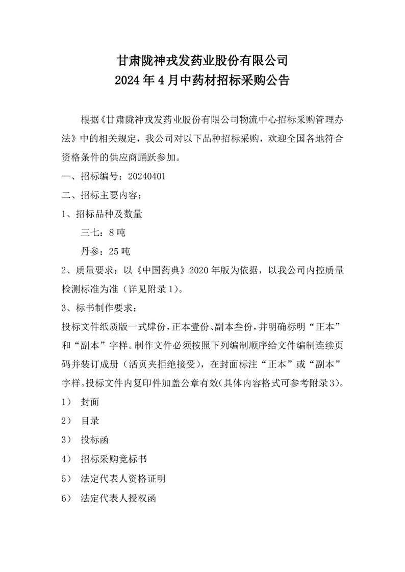 甘肅隴神戎發(fā)藥業(yè)股份有限公司 2024年4月中藥材招標(biāo)采購公告