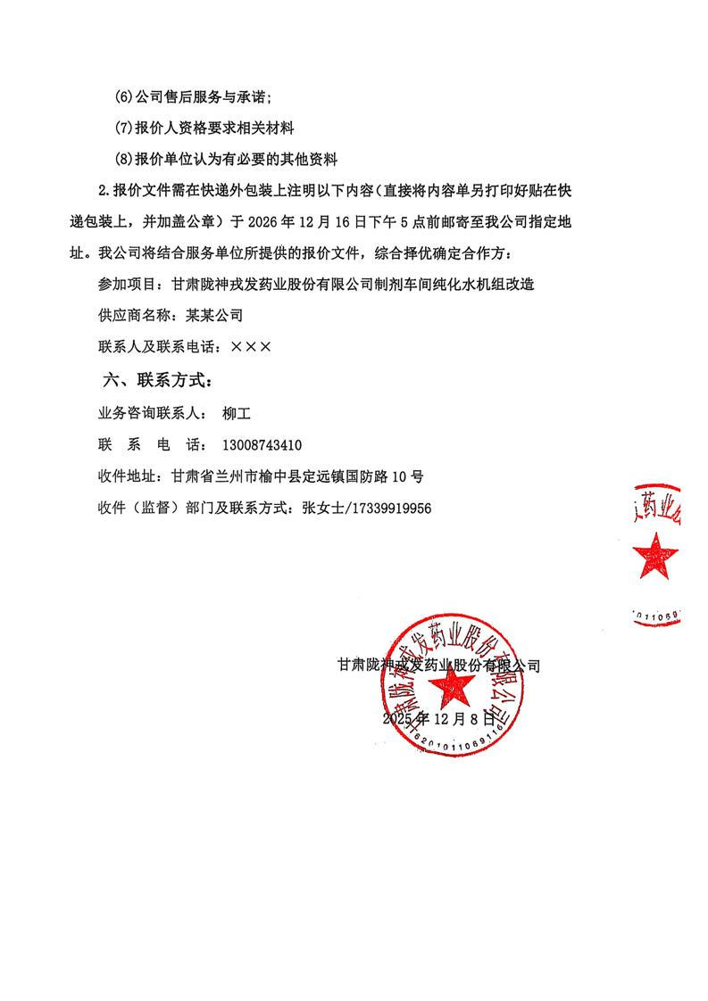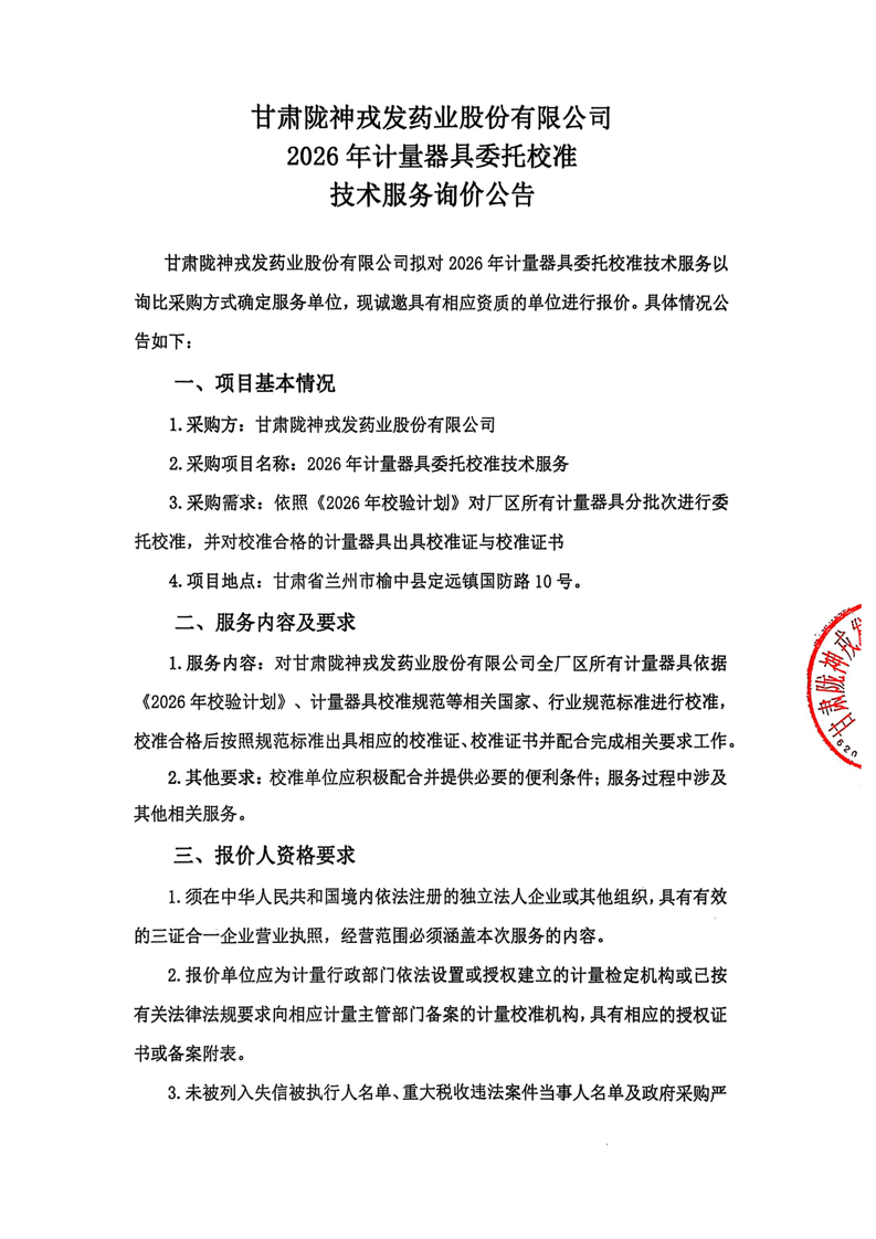 甘肅隴神戎發(fā)藥業(yè)股份有限公司2026年計量器具委托校準(zhǔn)技術(shù)服務(wù)詢價公告