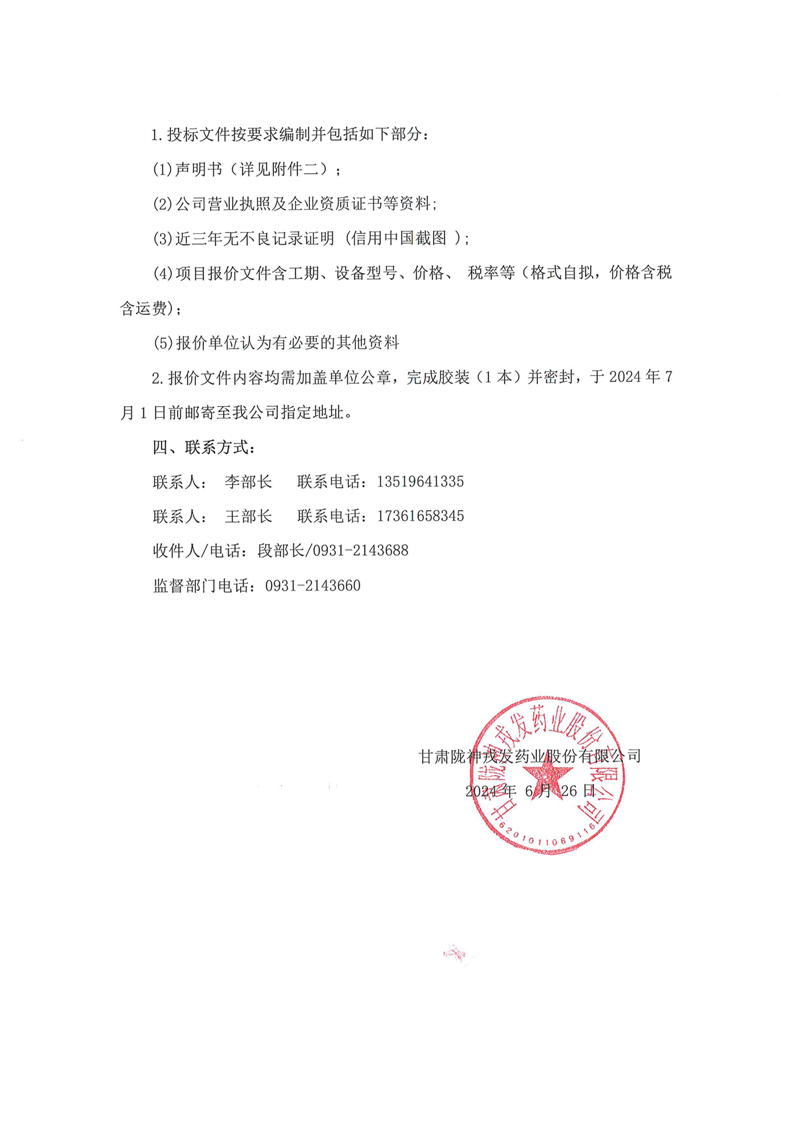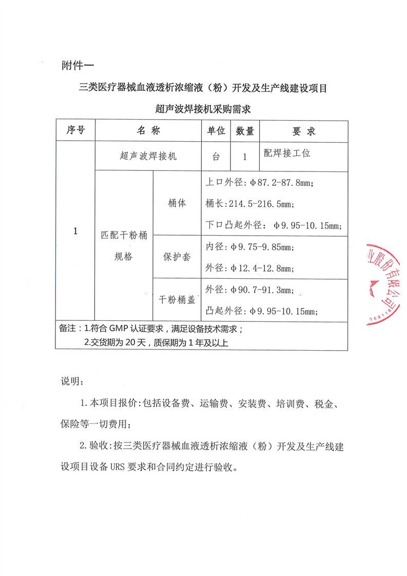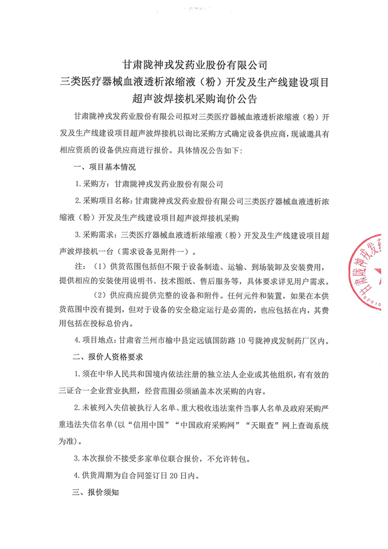 甘肅隴神戎發(fā)藥業(yè)股份有限公司三類醫(yī)療器械血液透析濃縮液(粉)開發(fā)及生產(chǎn)線建設(shè)項目超聲波焊接機采購詢價公告