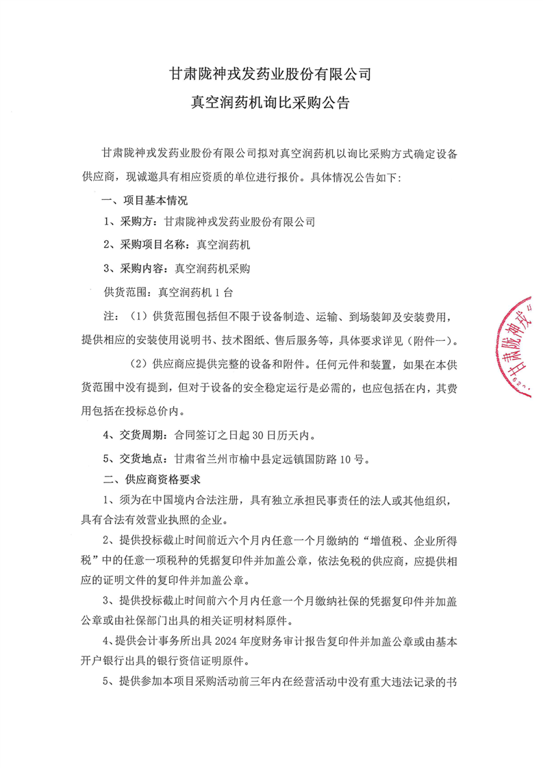 甘肅隴神戎發(fā)藥業(yè)股份有限公司真空潤藥機詢比采購公告