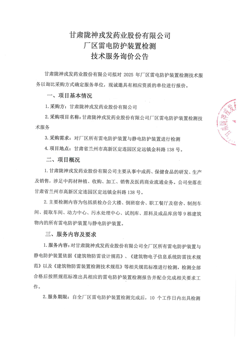 甘肅隴神戎發(fā)藥業(yè)股份有限公司廠區(qū)雷電防護(hù)裝置檢測(cè)技術(shù)服務(wù)詢價(jià)公告