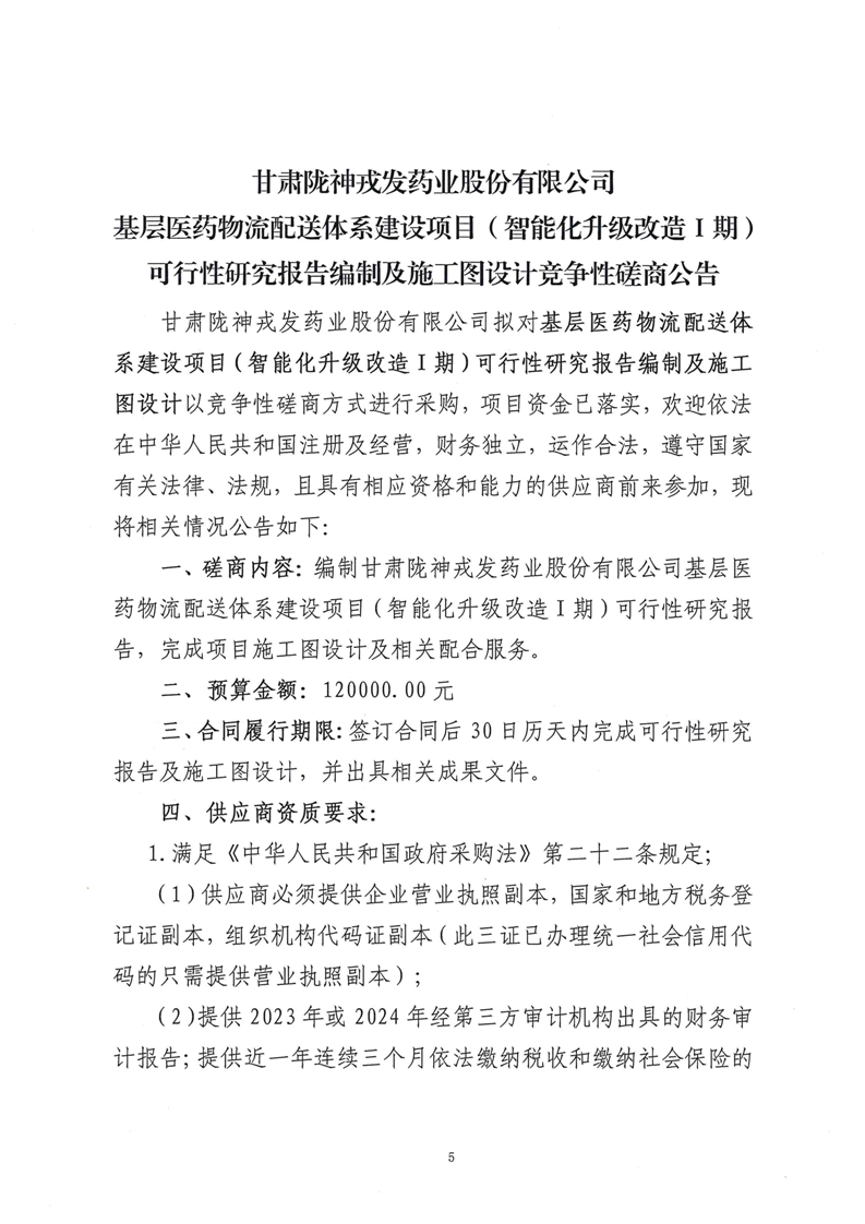 甘肅隴神戎發(fā)藥業(yè)股份有限公司基層醫(yī)藥物流配送體系建設項目(智能化升級改造Ⅰ期)可行性研究報告編制及施工圖設計競爭性磋商公告
