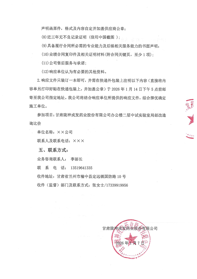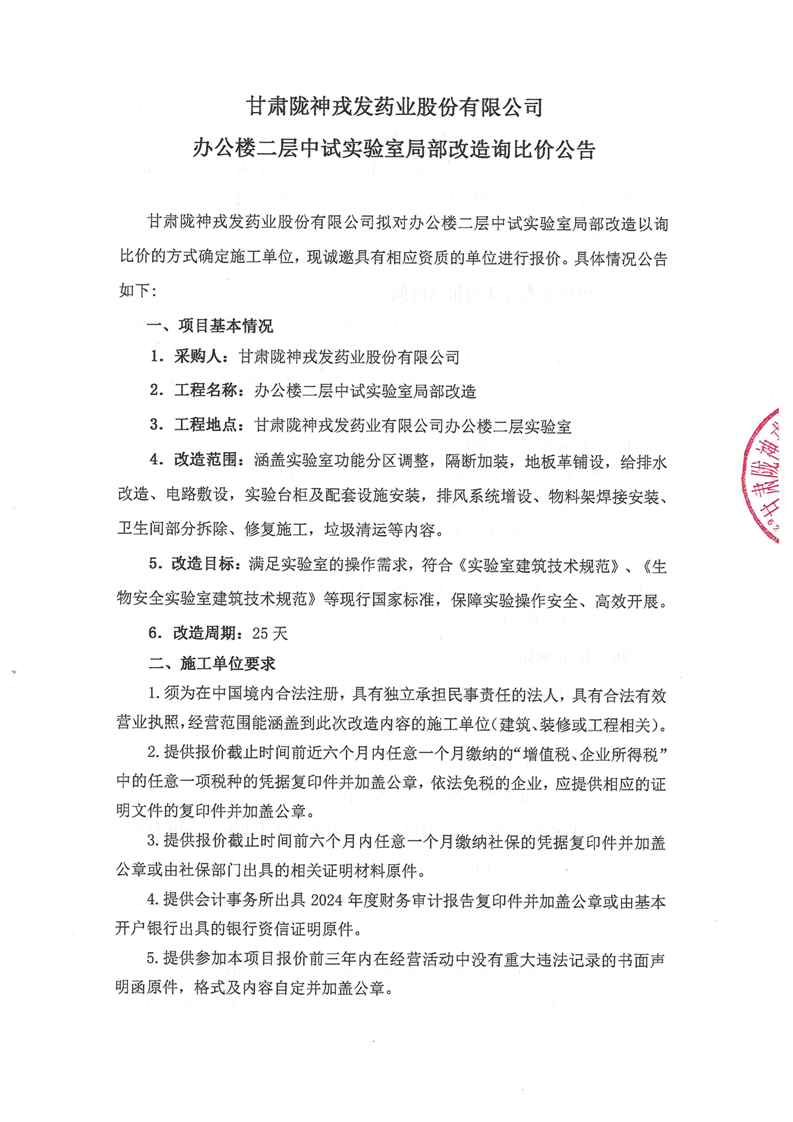 甘肅隴神戎發(fā)藥業(yè)股份有限公司辦公室二層中試實(shí)驗(yàn)室局部改造詢比價(jià)公告