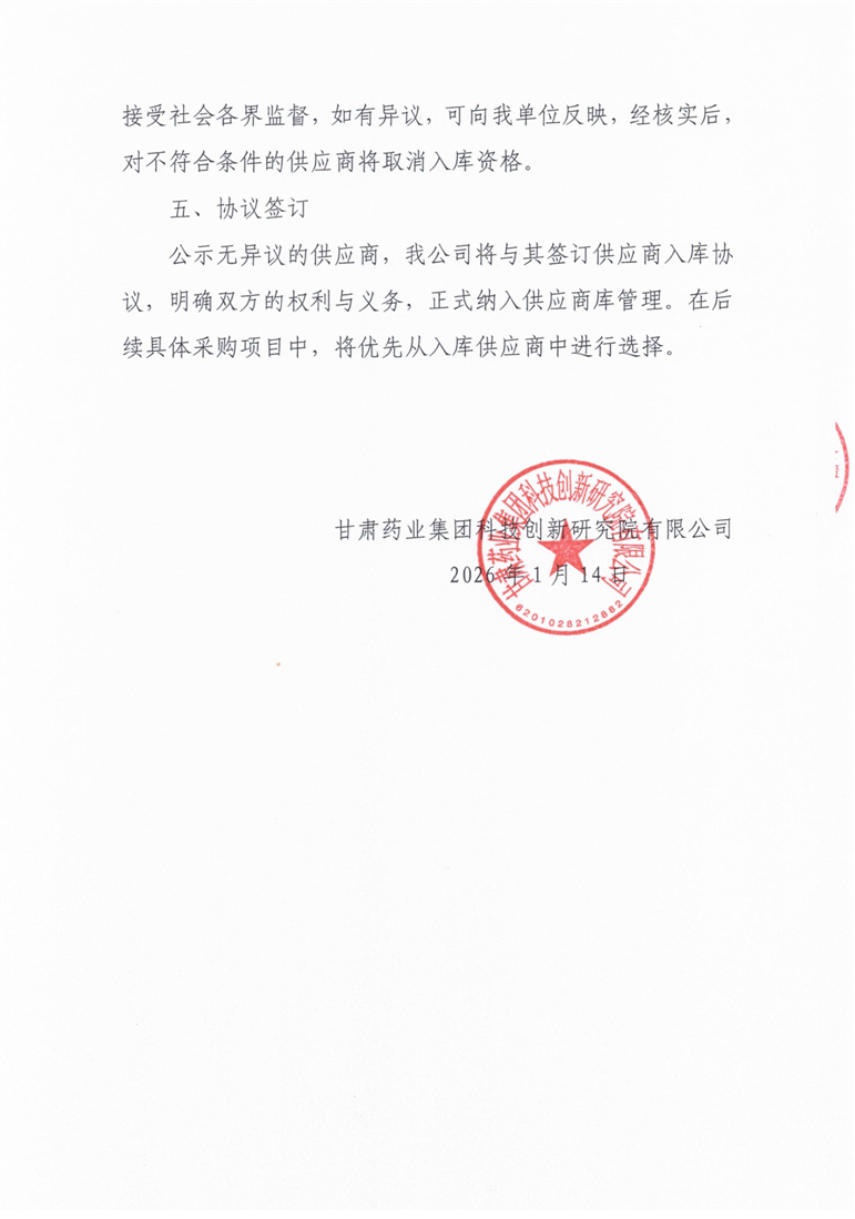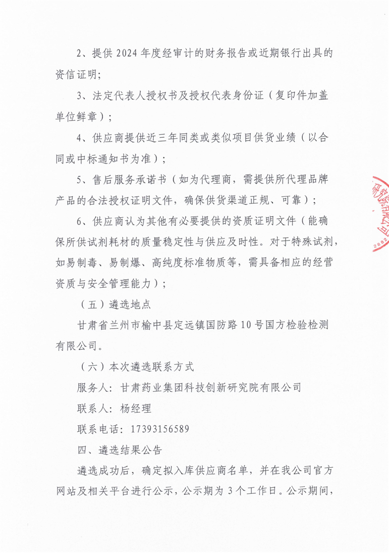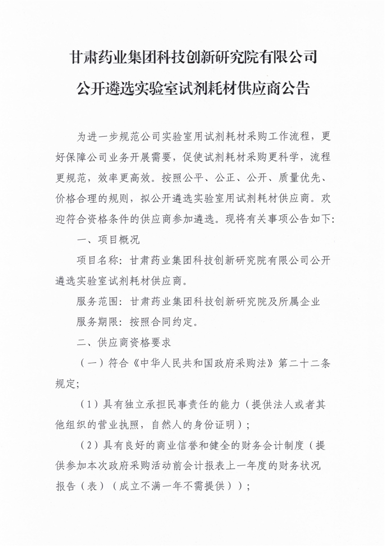 甘肅藥業(yè)集團(tuán)科技創(chuàng)新研究院有限公司公開(kāi)遴選實(shí)驗(yàn)室試劑耗材供應(yīng)商公告