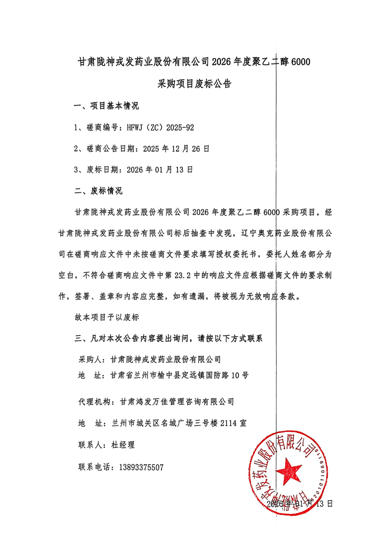 甘肅隴神戎發(fā)藥業(yè)股份有限公司2026年度聚乙二醇6000采購項目廢標公告