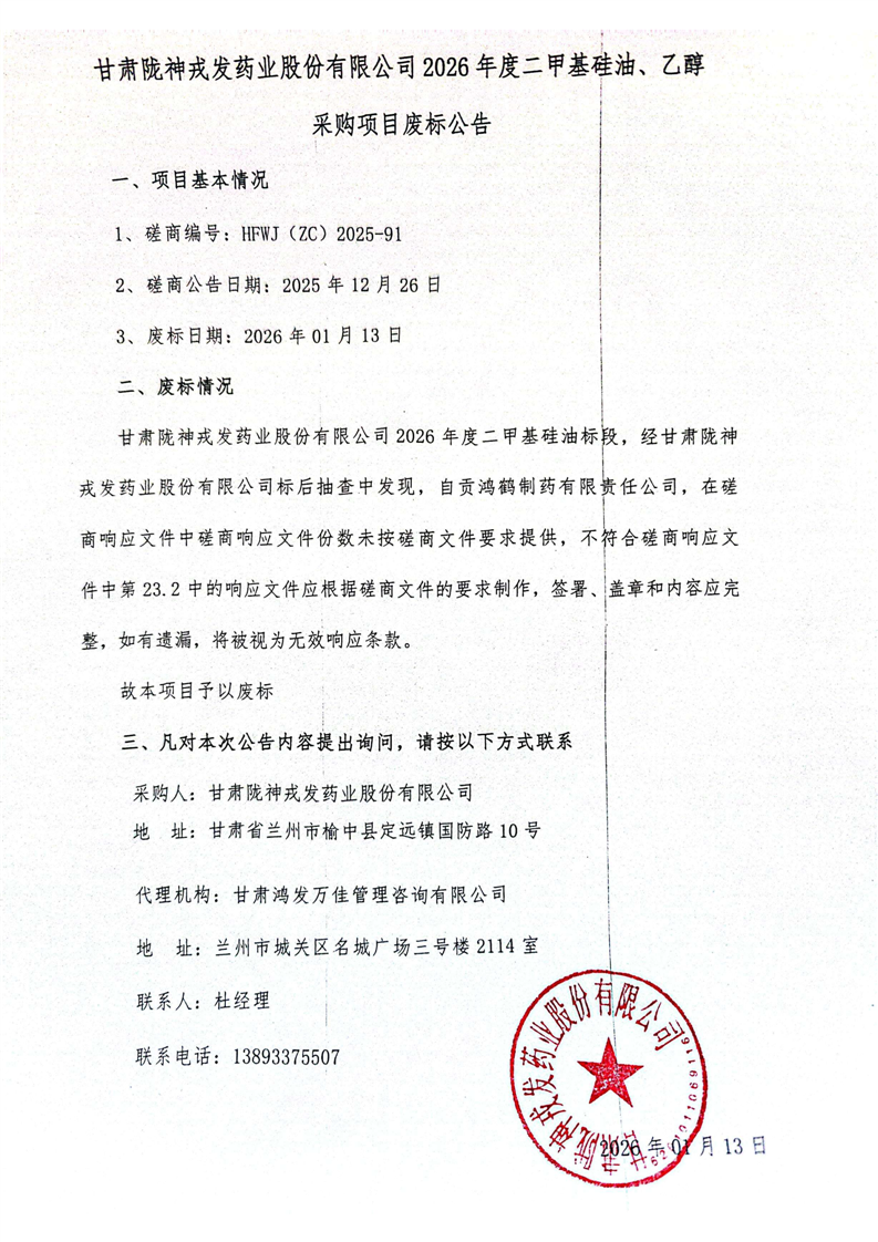 甘肅隴神戎發(fā)藥業(yè)股份有限公司2026年度二甲基硅油、乙醇采購項目廢標(biāo)公告