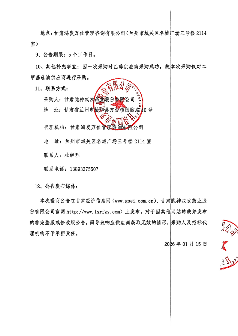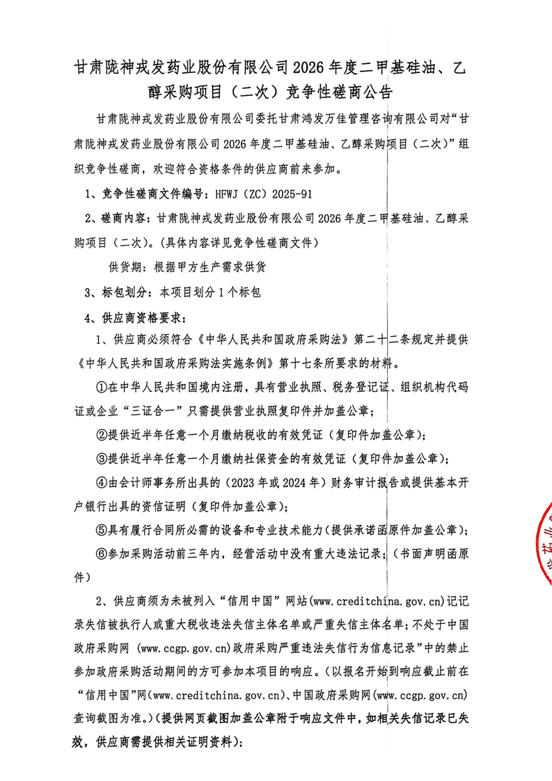 甘肅隴神戎發(fā)藥業(yè)股份有限公司2026年度二甲基硅油、乙醇采購(gòu)項(xiàng)目(二次)競(jìng)爭(zhēng)性磋商公告