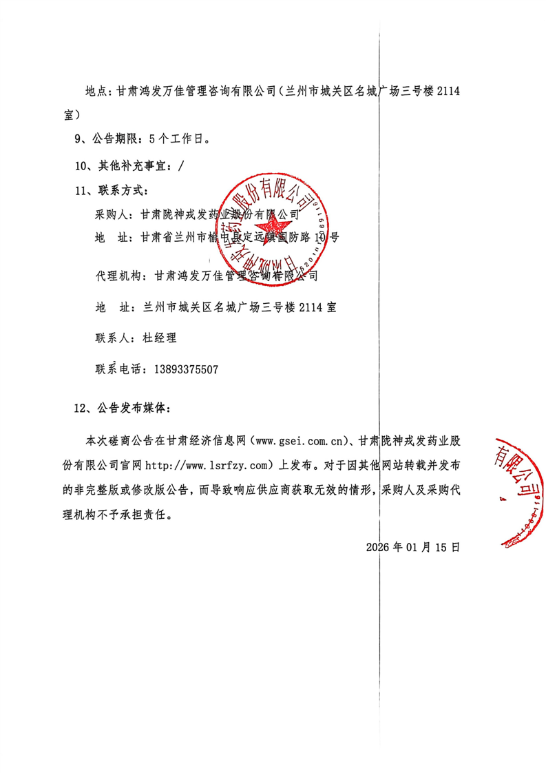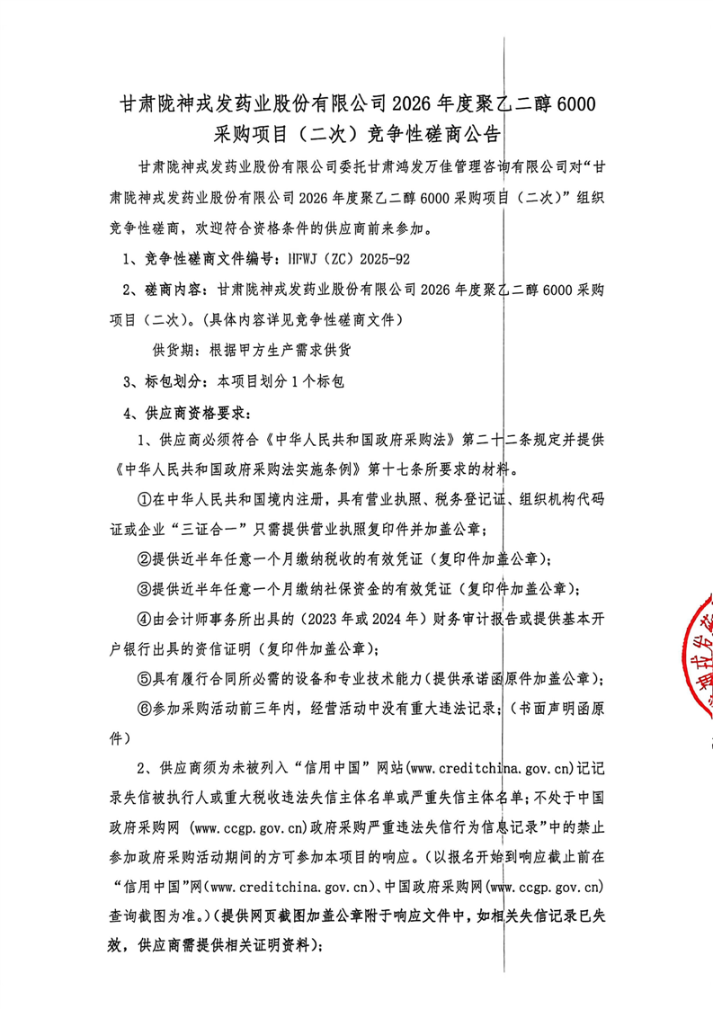 甘肅隴神戎發(fā)藥業(yè)股份有限公司2026年度聚乙二醇6000采購項(xiàng)目(二次)競爭性磋商公告