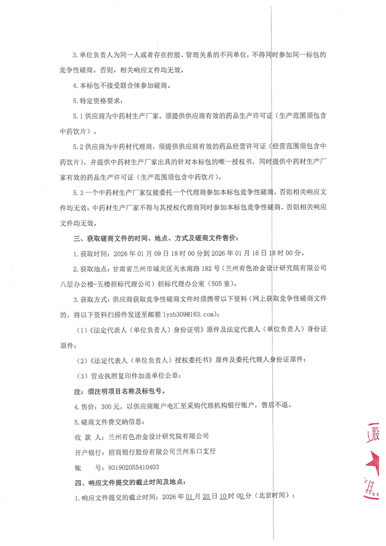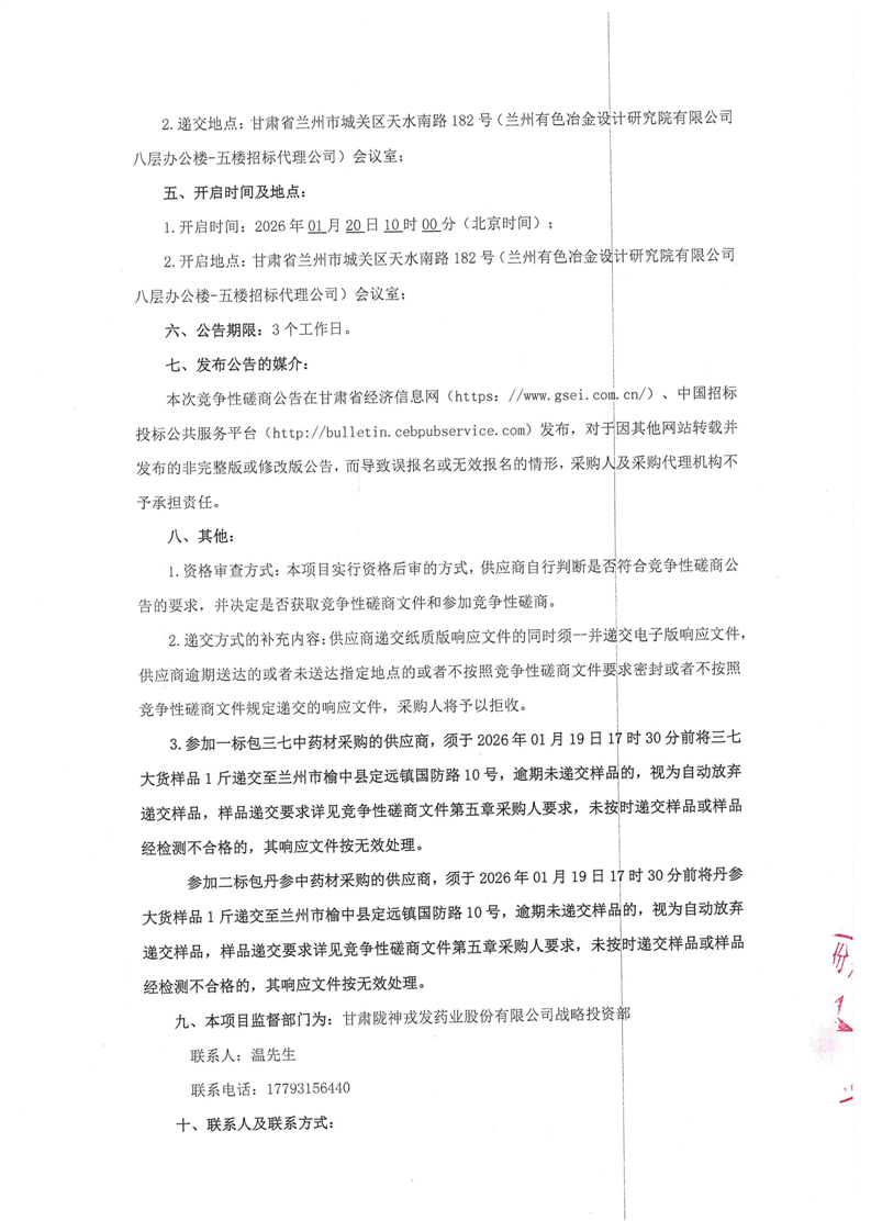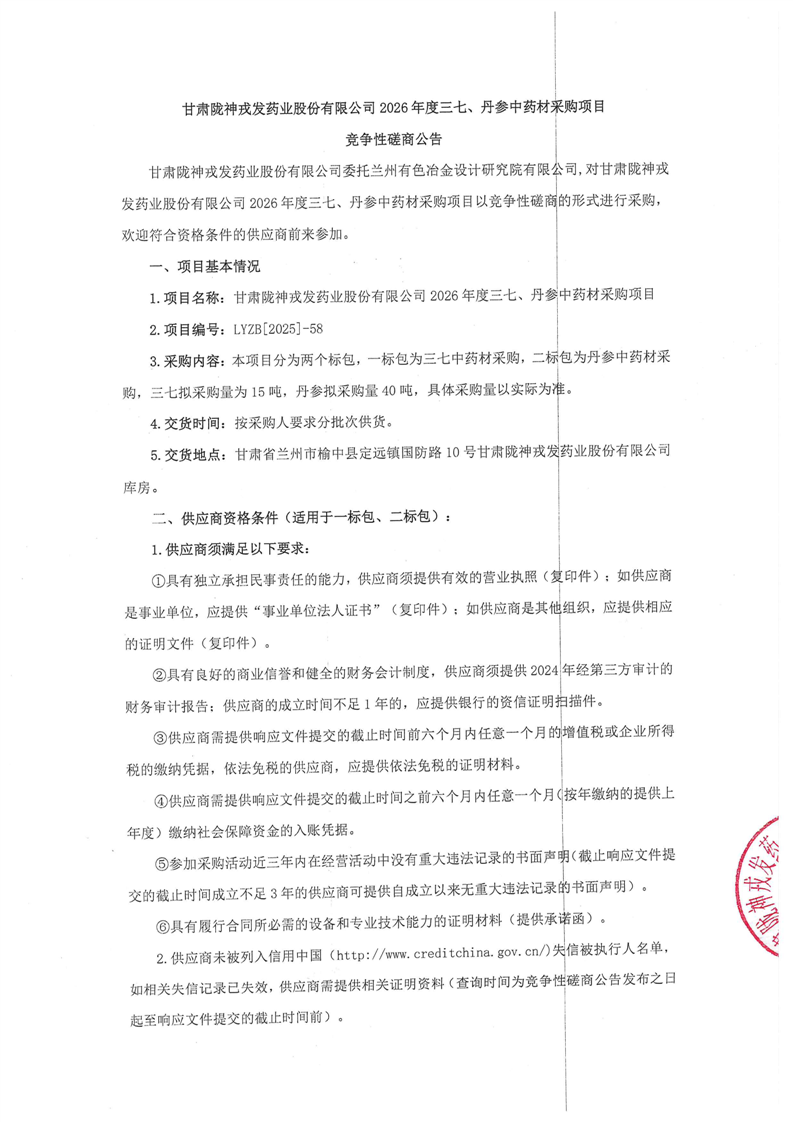 甘肅隴神戎發(fā)藥業(yè)股份有限公司2026年度三七、丹參中藥材采購項目競爭性磋商公告