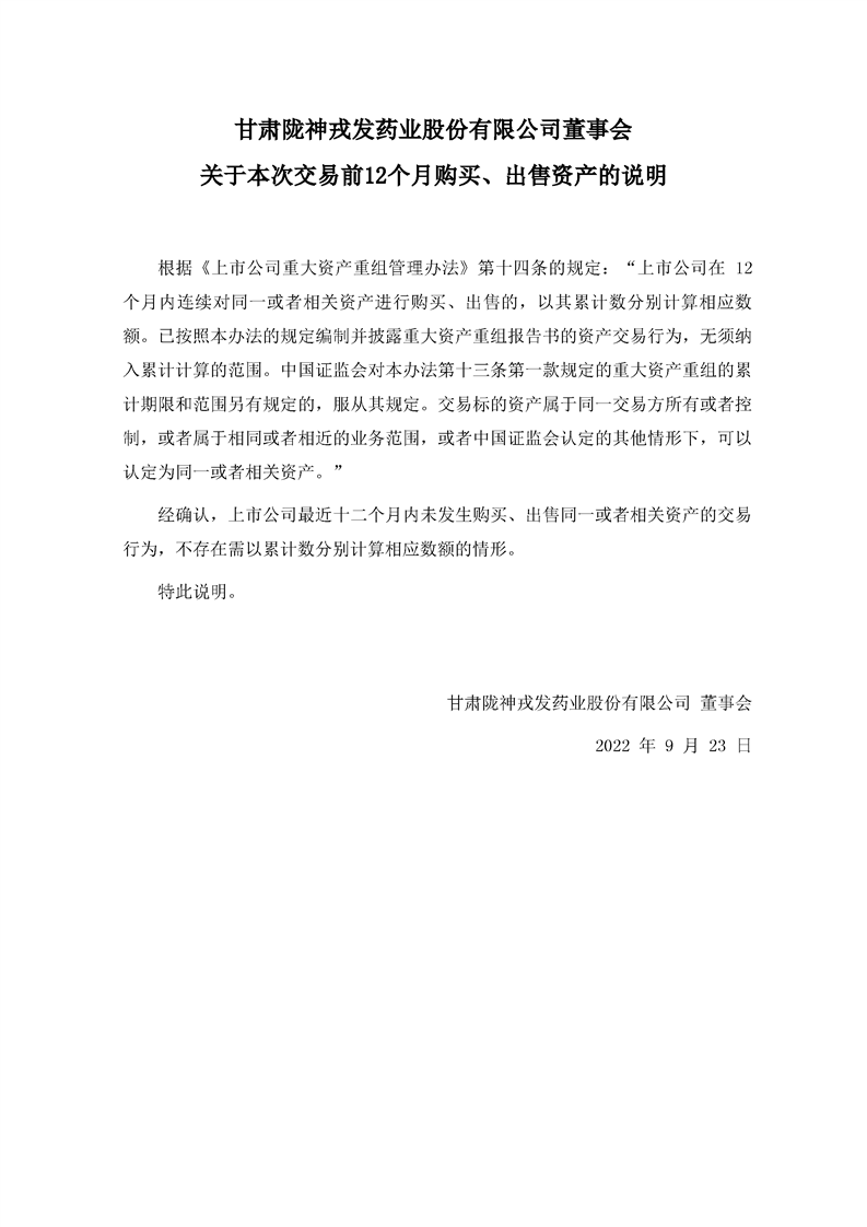 董事會(huì)關(guān)于本次交易前12個(gè)月購買、出售資產(chǎn)的說明