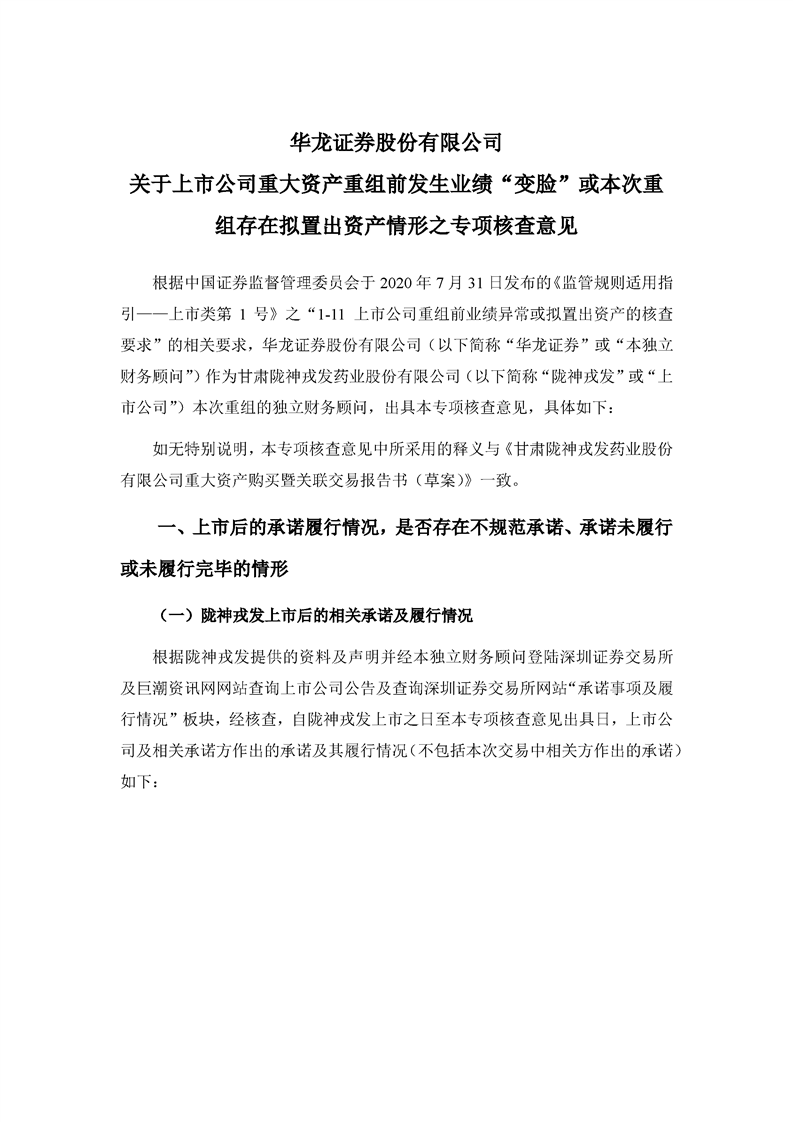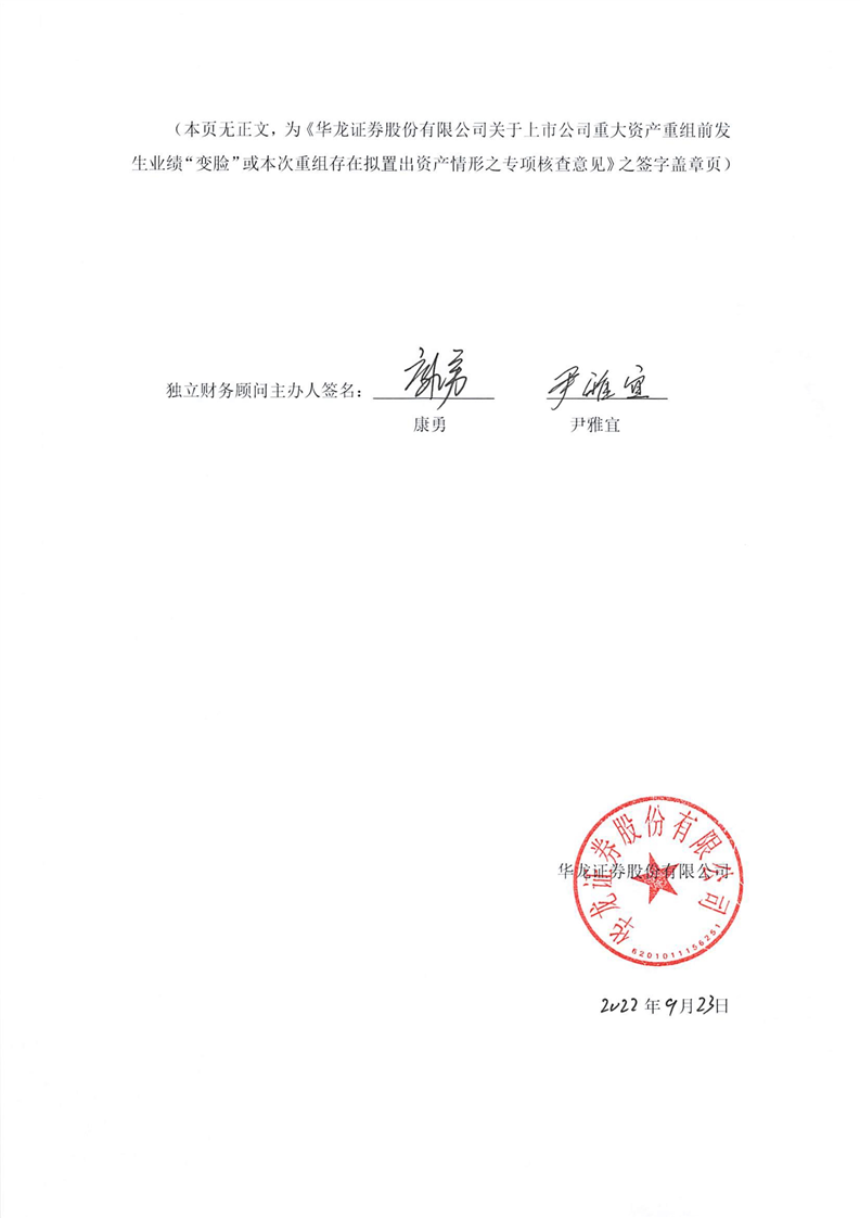 華龍證券股份有限公司關(guān)于上市公司重大資產(chǎn)重組前發(fā)生業(yè)績(jī)變臉或本次重組存在擬置出資產(chǎn)情形之專項(xiàng)核查意見(jiàn)