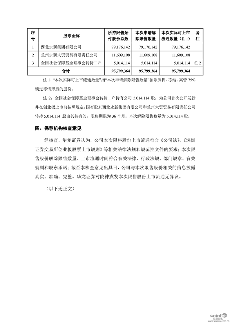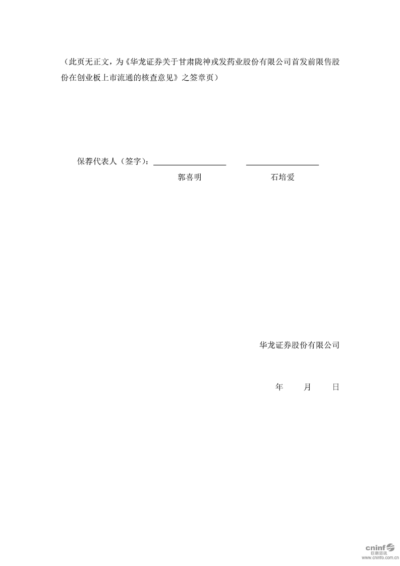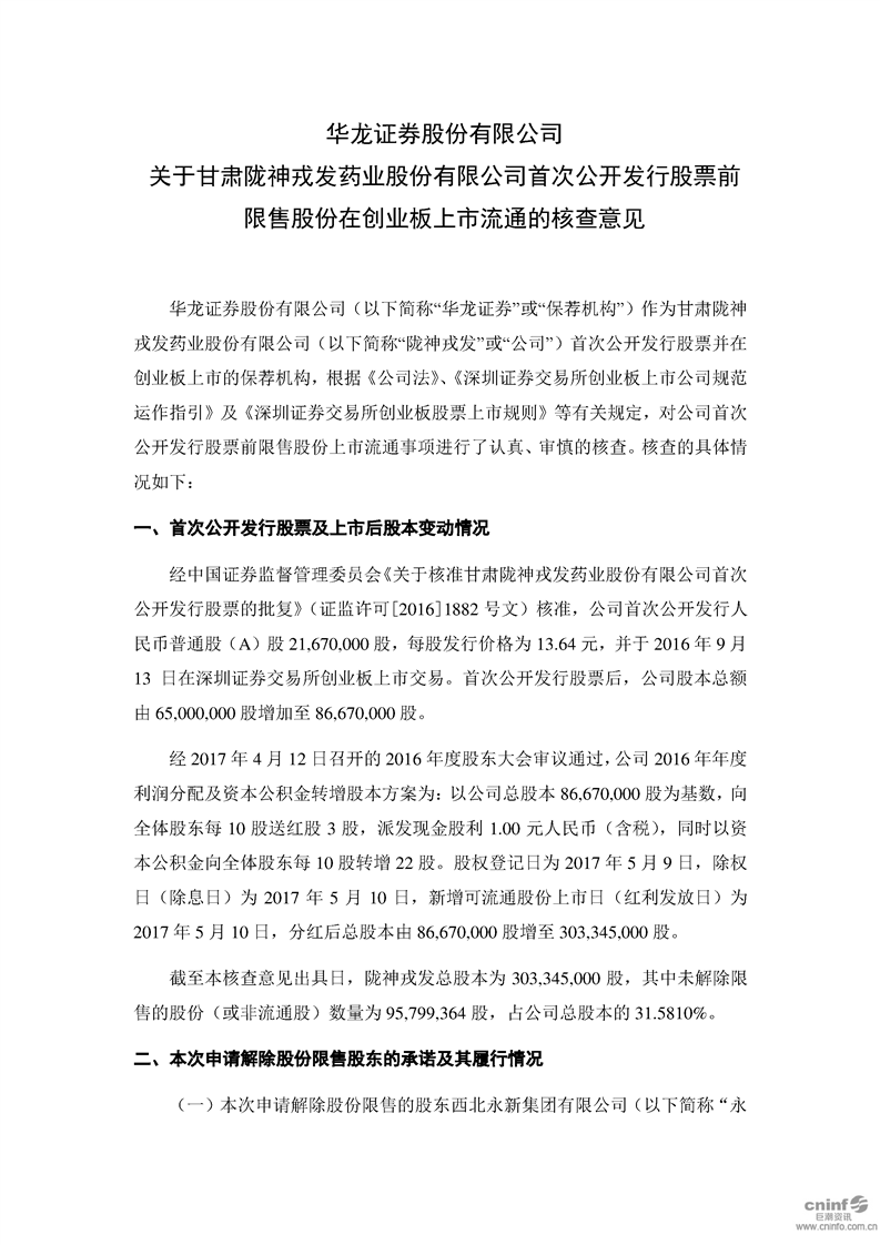 華龍證券股份有限公司關(guān)于公司首次公開發(fā)行股票前限售股份在創(chuàng)業(yè)板上市流通的核查意見