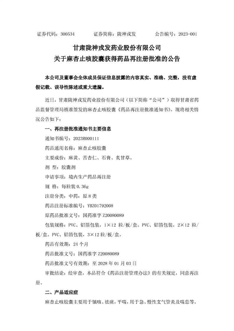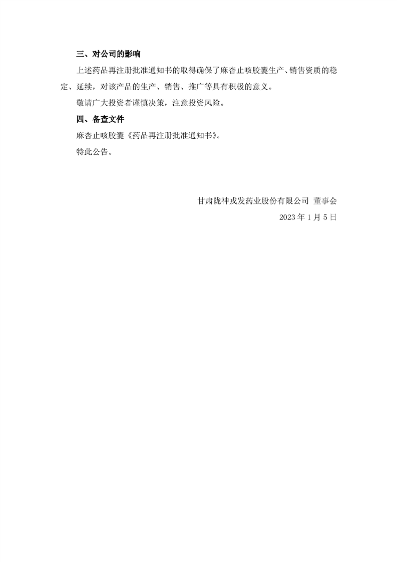 關(guān)于麻杏止咳膠囊獲得藥品再注冊(cè)批準(zhǔn)的公告