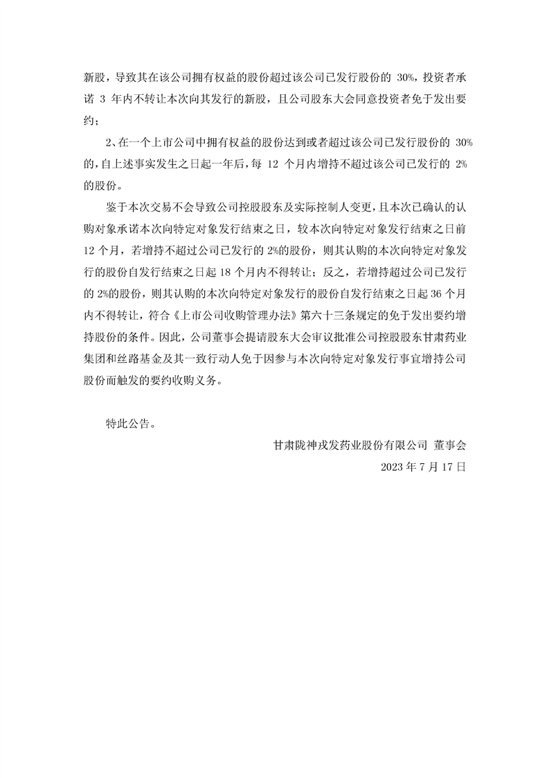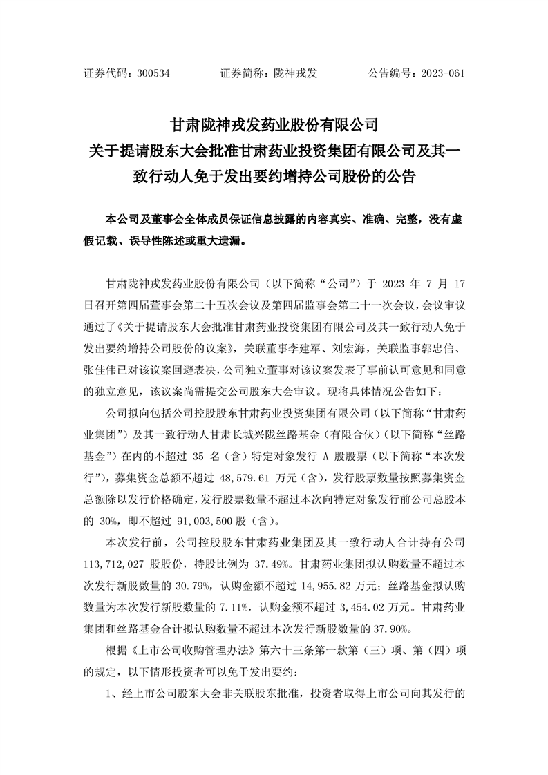 關(guān)于提請股東大會批準甘肅藥業(yè)投資集團有限公司及其一致行動人免于發(fā)出要約增持公司股份的公告