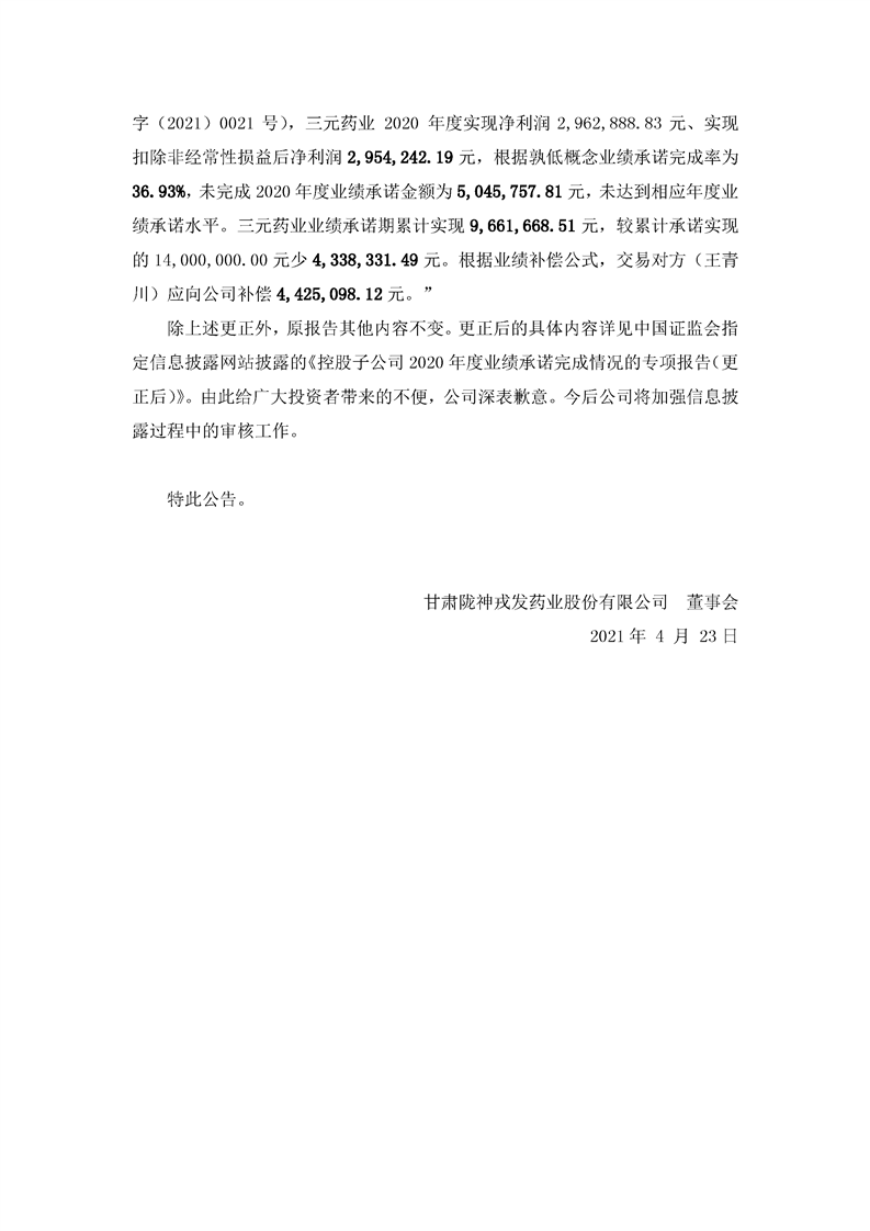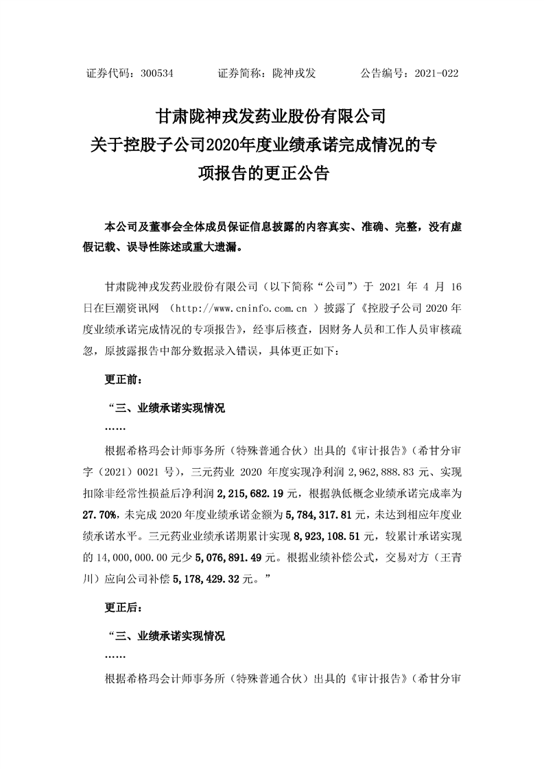 關于控股子公司2020年度業(yè)績承諾完成情況的專項報告的更正公告