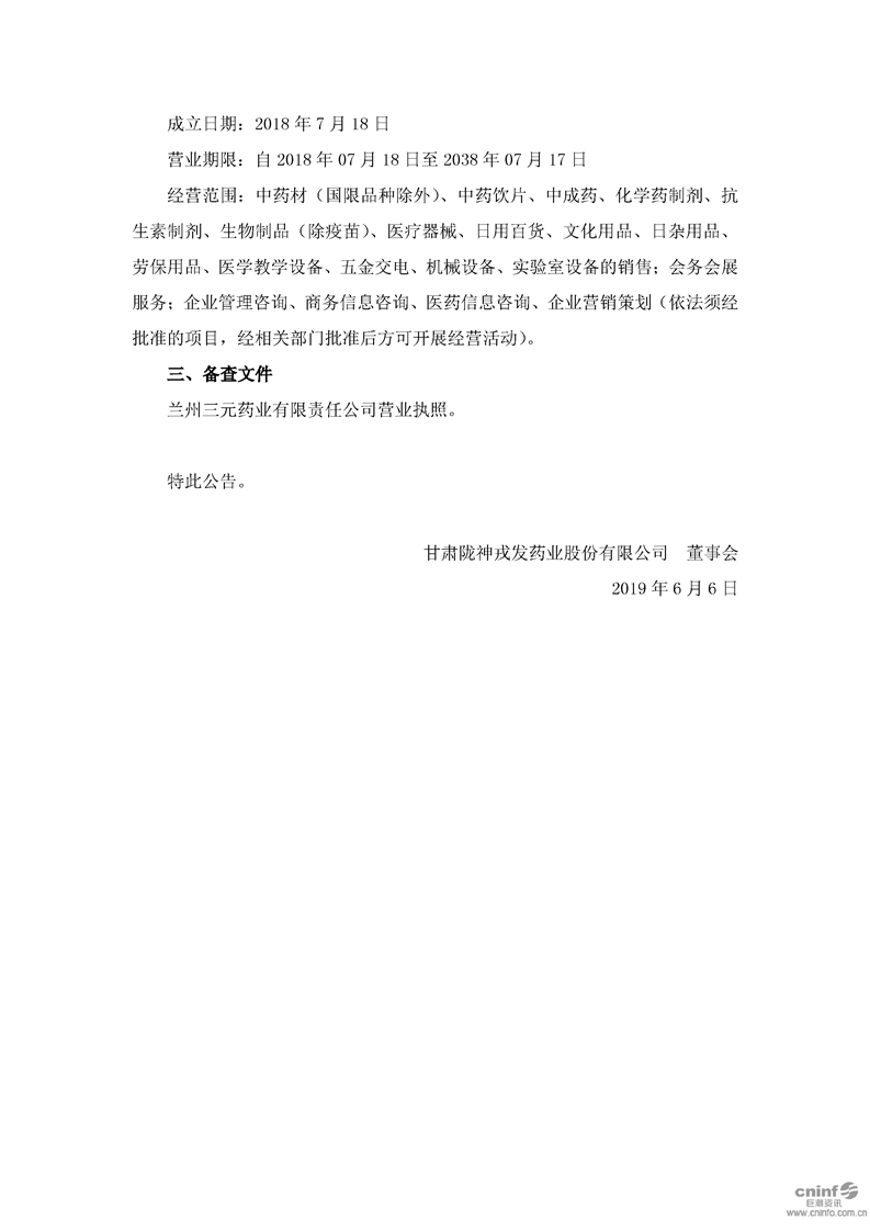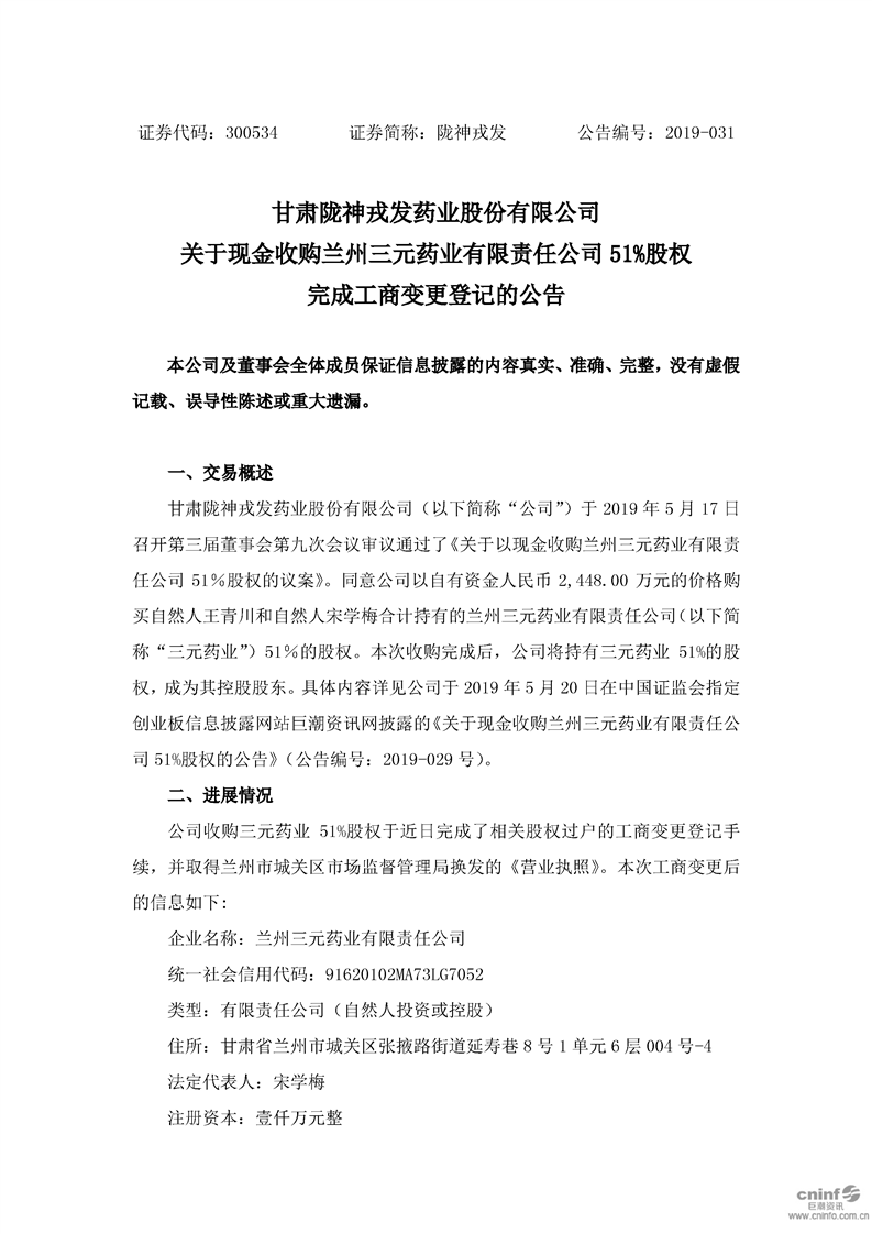 關(guān)于現(xiàn)金收購(gòu)蘭州三元藥業(yè)有限責(zé)任公司51%股權(quán)完成工商變更登記的公告