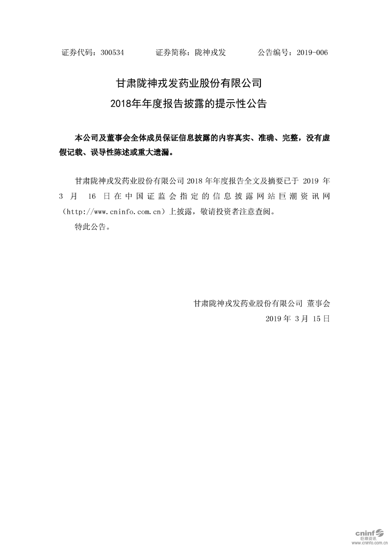 2018年年度報告披露的提示性公告