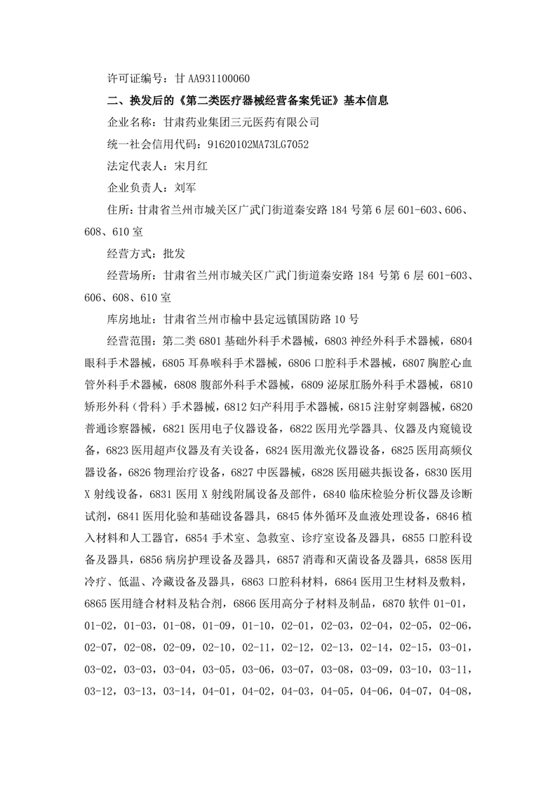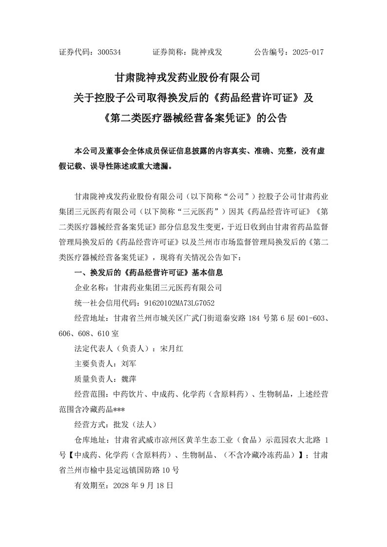 關(guān)于控股子公司取得換發(fā)后的《藥品經(jīng)營許可證》及《第二類醫(yī)療器械經(jīng)營備案憑證》的公告