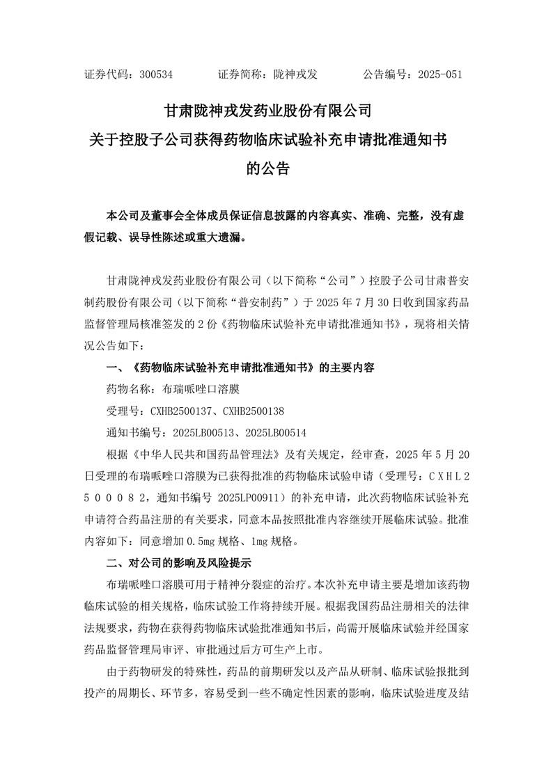 關(guān)于控股子公司獲得藥物臨床試驗(yàn)補(bǔ)充申請批準(zhǔn)通知書的公告