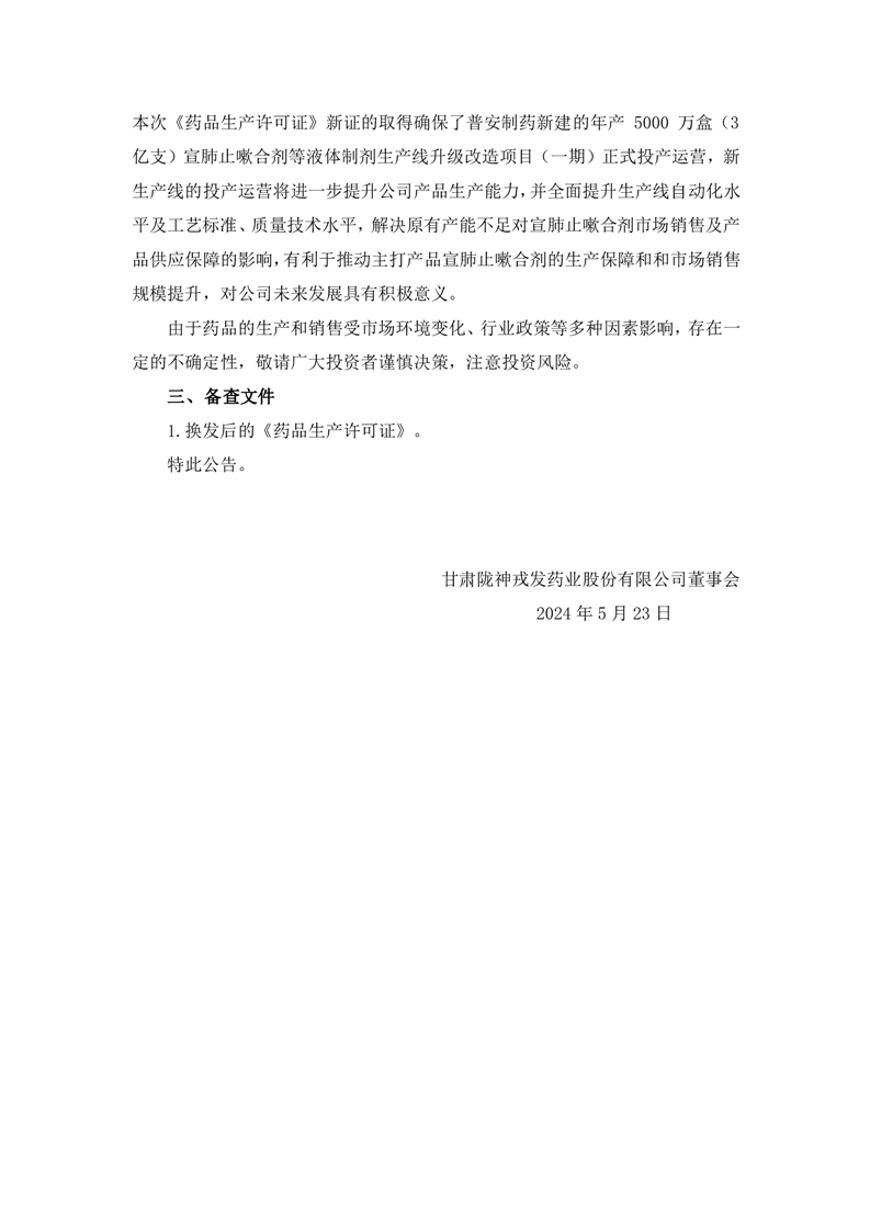 關(guān)于控股子公司取得換發(fā)后的《藥品生產(chǎn)許可證》的公告