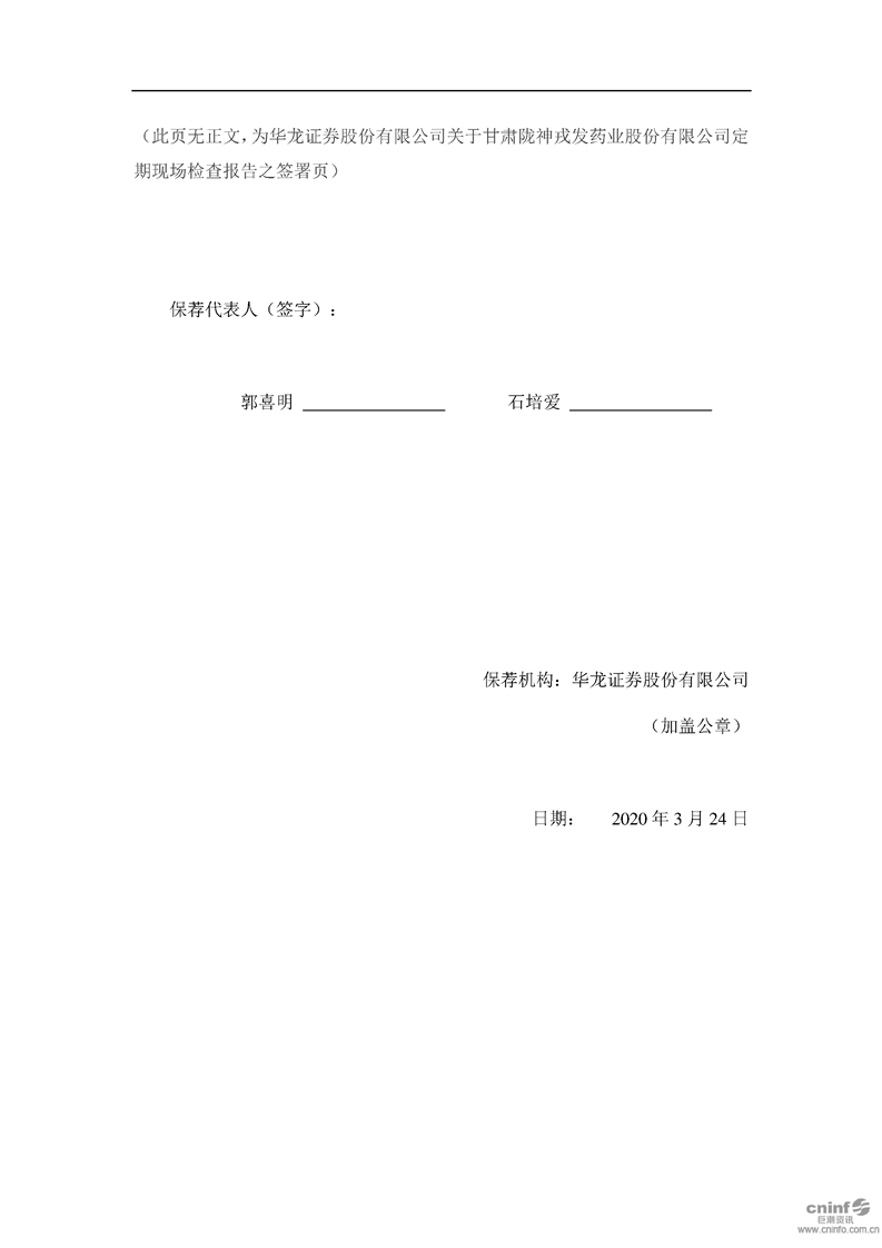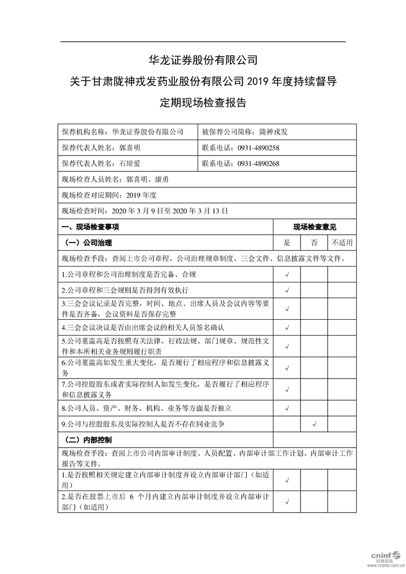 華龍證券股份有限公司關(guān)于公司2019年度持續(xù)督導(dǎo)定期現(xiàn)場檢查報告