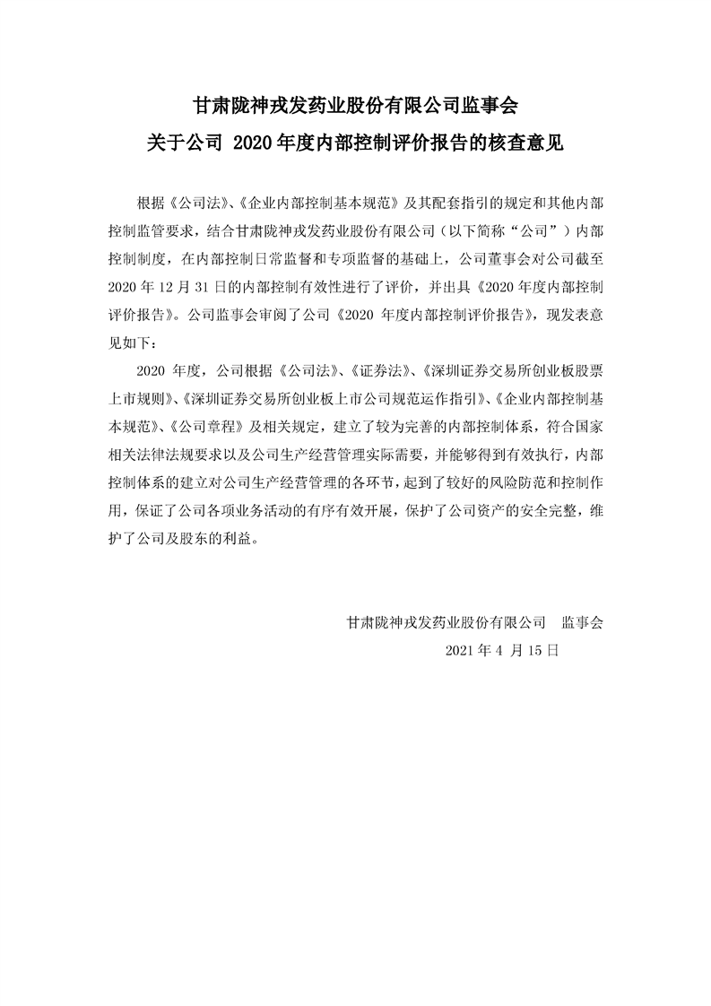 監(jiān)事會(huì)關(guān)于公司2020年度內(nèi)部控制評(píng)價(jià)報(bào)告的核查意見