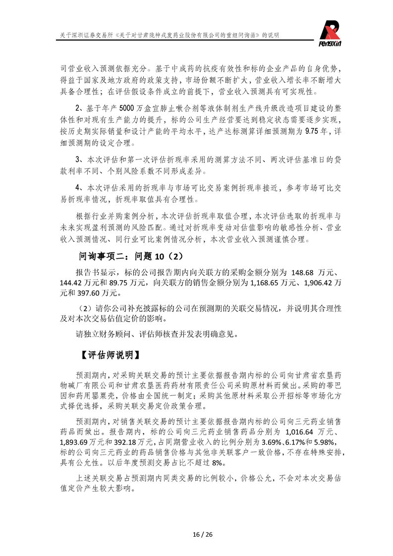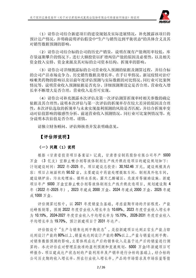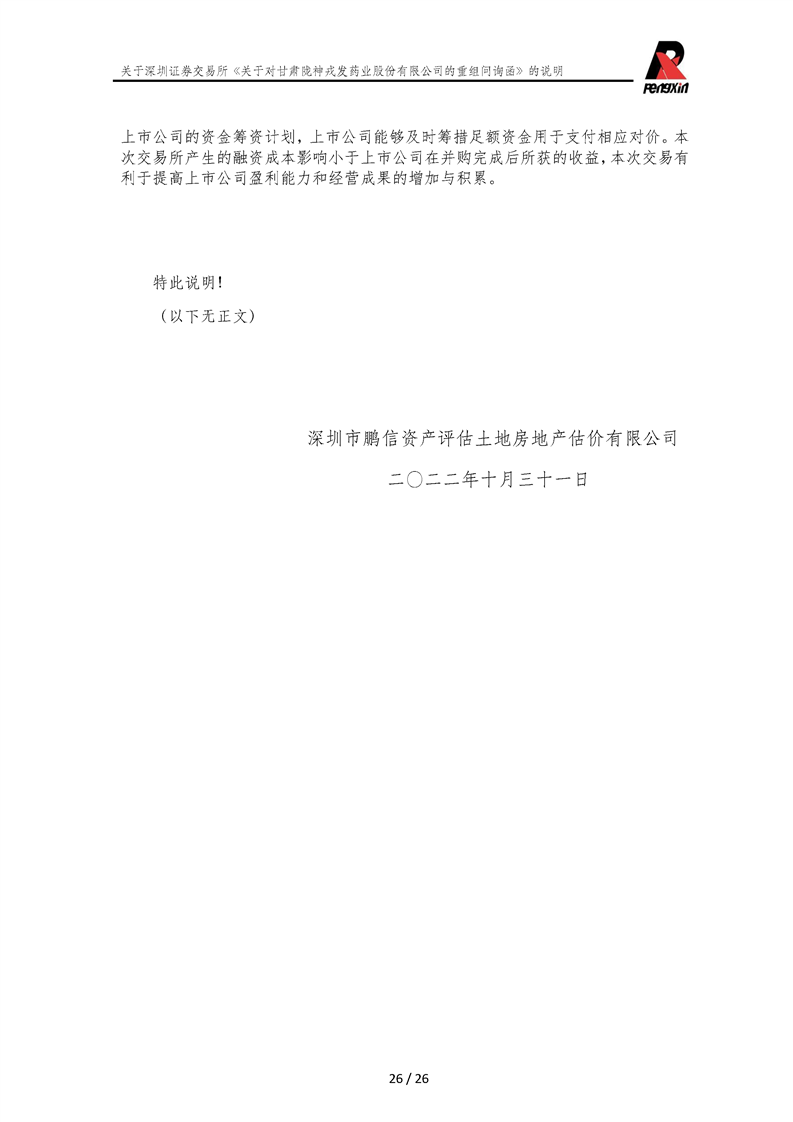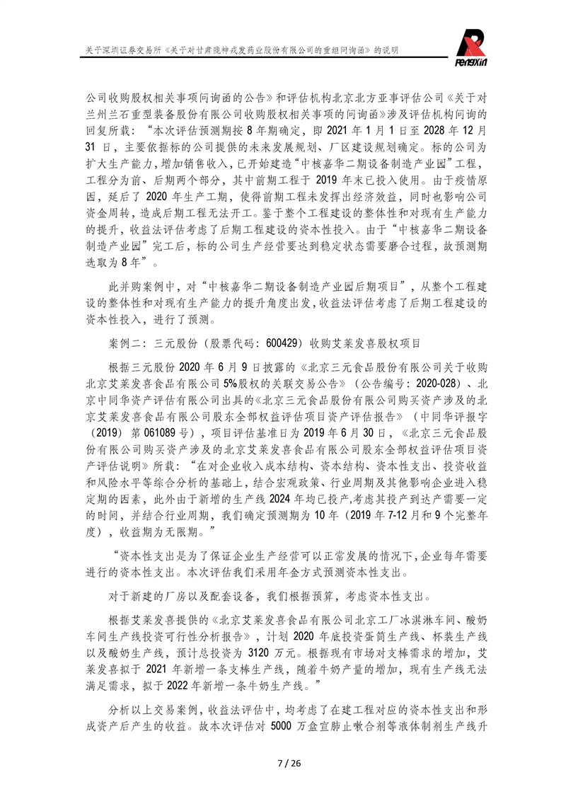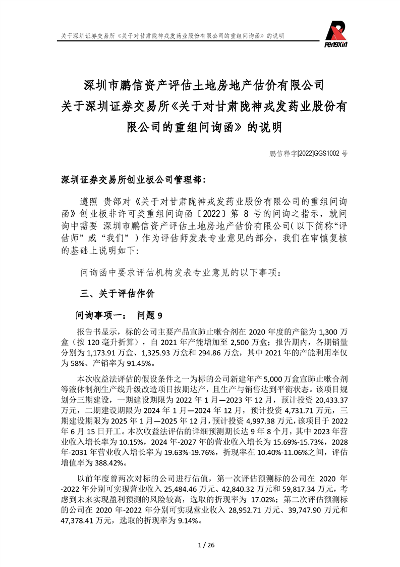 鵬信資產(chǎn)評(píng)估《關(guān)于對(duì)甘肅隴神戎發(fā)藥業(yè)股份有限公司的重組問詢函》的說明