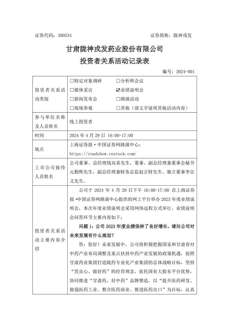 300534隴神戎發(fā)投資者關(guān)系管理信息20240429