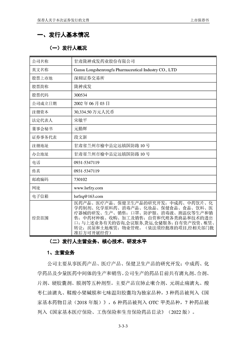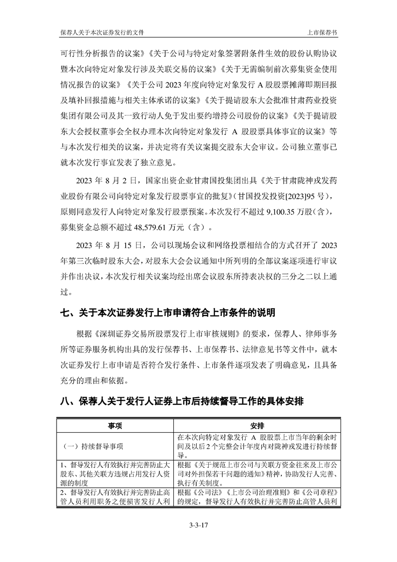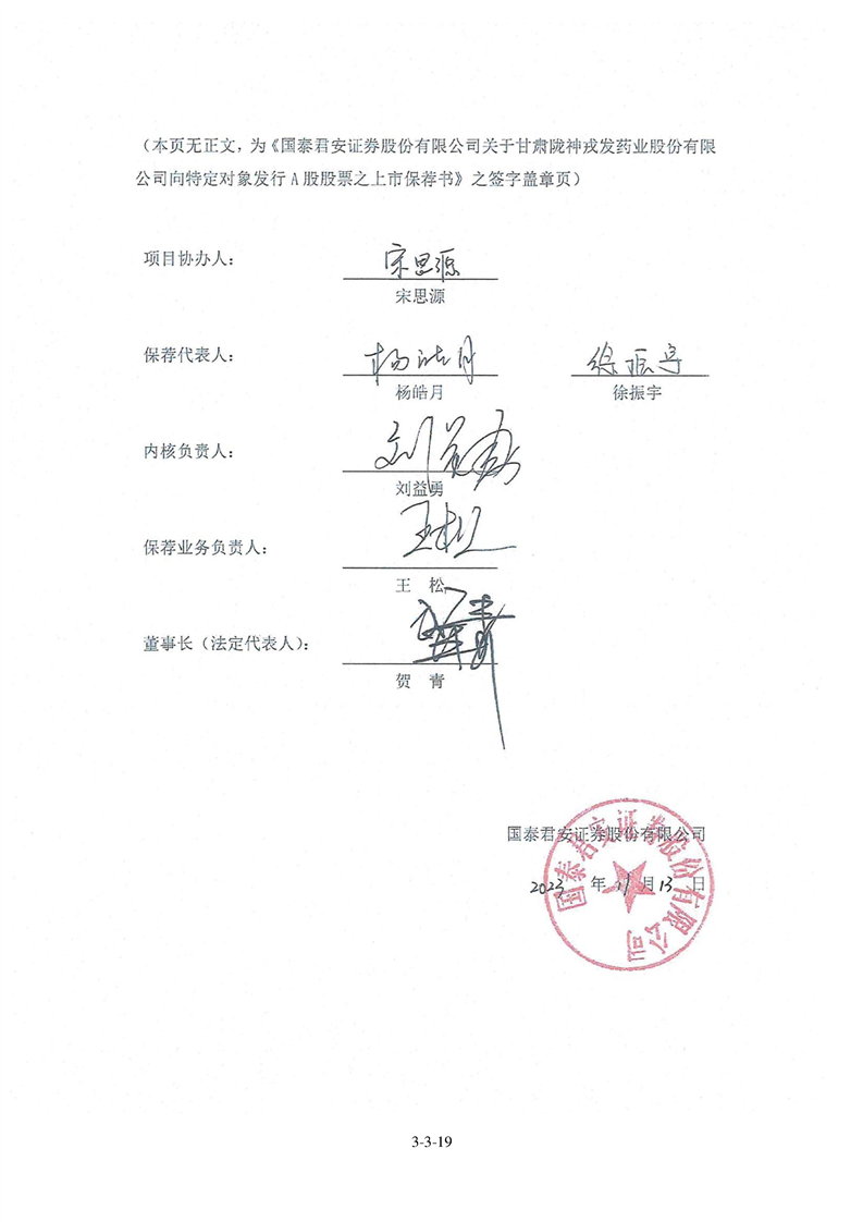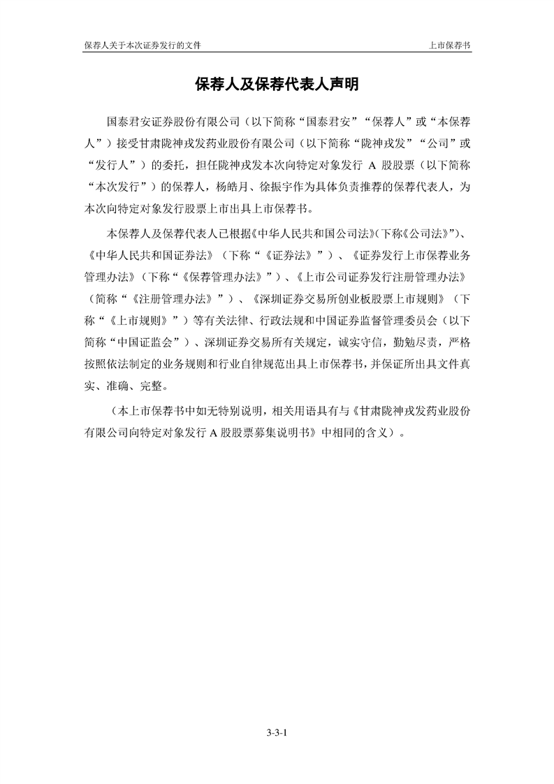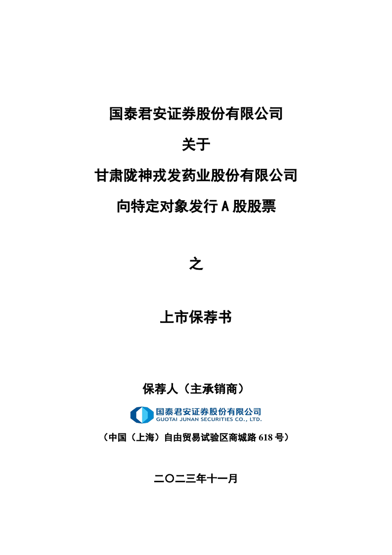 國泰君安證券股份有限公司關(guān)于甘肅隴神戎發(fā)藥業(yè)股份有限公司向特定對象發(fā)行A股股票之上市保薦書