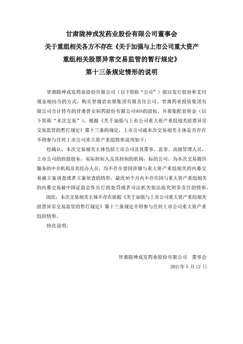 董事會關于重組相關各方不存在《關于加強與上市公司重大資產重組相關股票異常交易監(jiān)管的暫行規(guī)定》第十三條規(guī)定情形的說明