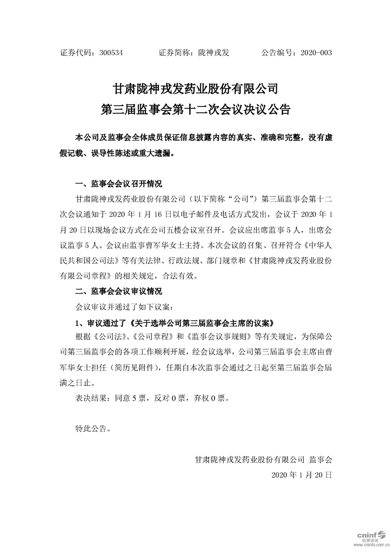 第三屆監(jiān)事會(huì)第十二次會(huì)議決議公告