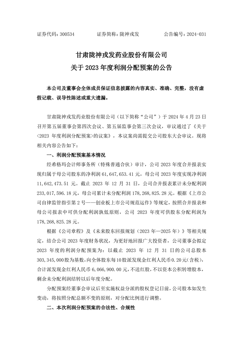 關(guān)于2023年度利潤分配預(yù)案的公告